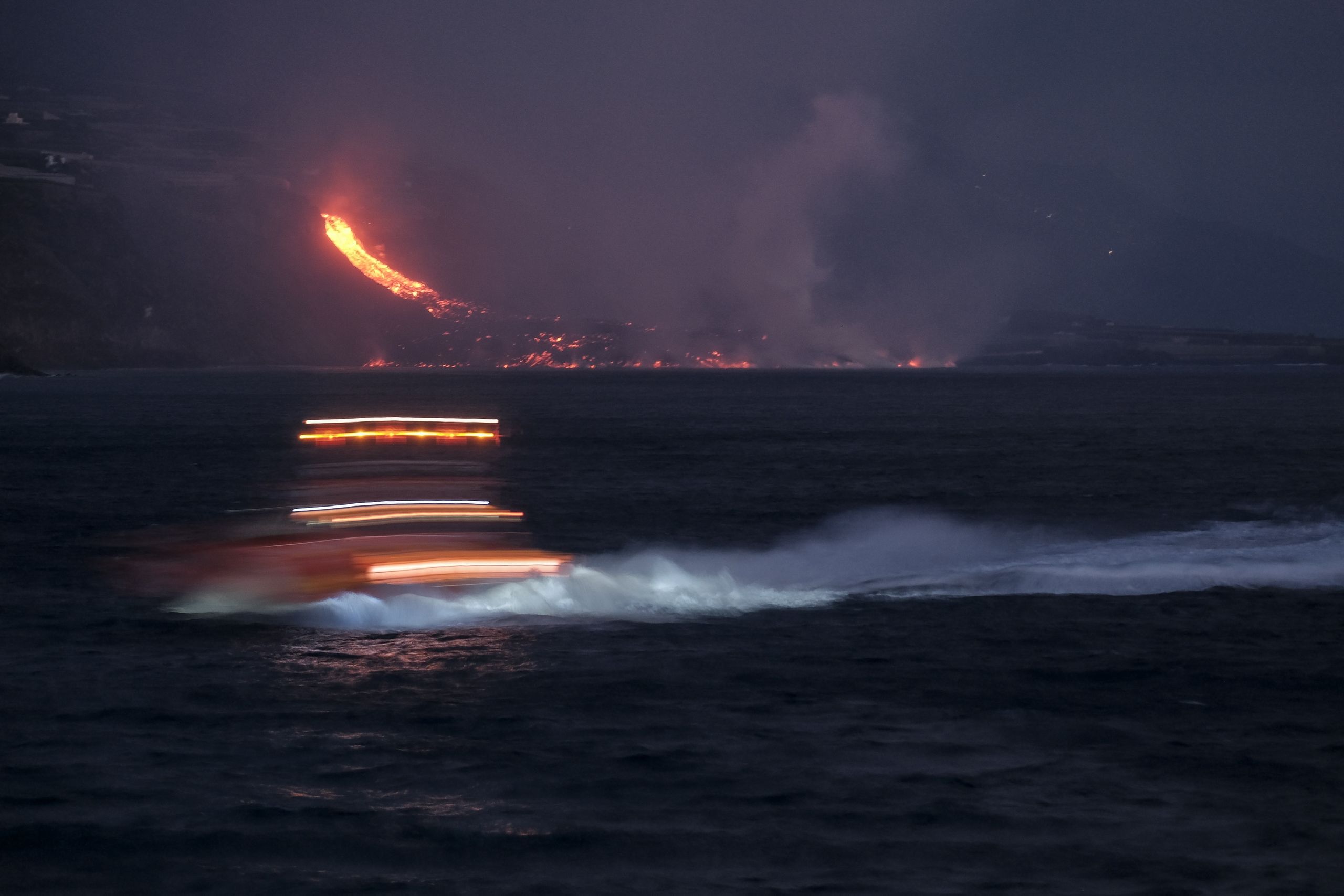 La lava del volcán de Cumbre Vieja ha comenzado a ganarle terreno al mar hasta formar un delta de unos 500 metros de ancho y, de momento, el viento mantiene alejada de la costa la columna de vapor de agua y de gases posiblemente tóxicos generada por el contacto entre el magma y el océano.