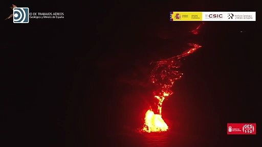 Imágenes del vuelo de un dron captando espectaculares imágenes de la cascada de lava precipitándose al mar y formando el incipiente delta.