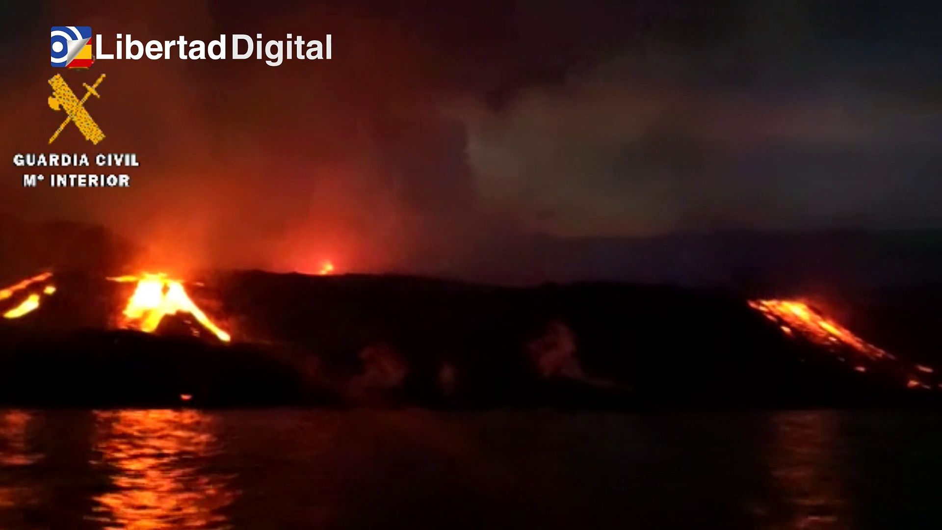 Nuevas imágenes de la cascada de lava llegando al mar captadas por una patrullera del Servicio Marítimo de la Guardia Civil durante esta noche.