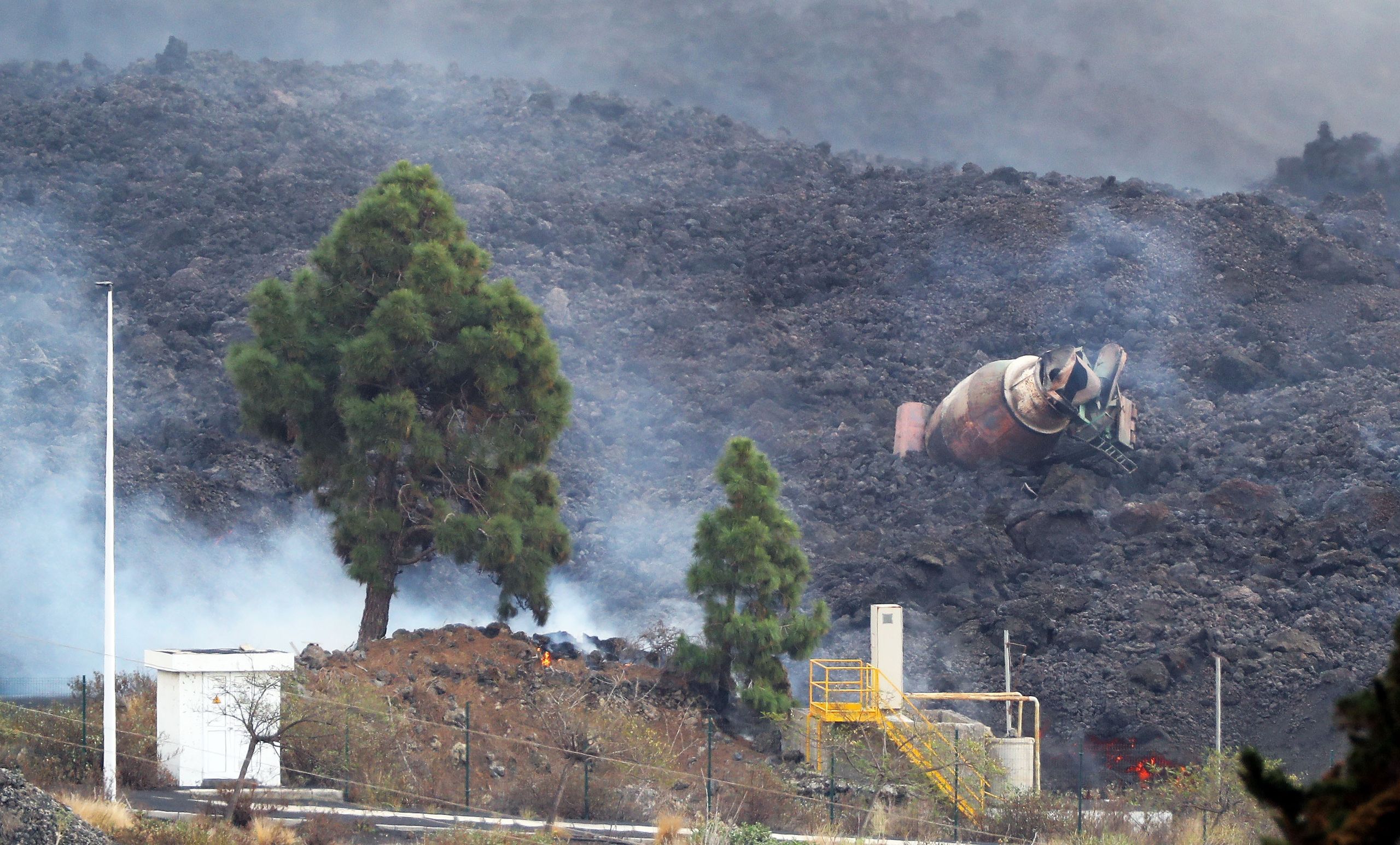 Aislada entre dos lenguas apreciamos, como sitiada, lo que parece ser una cementera, con varias hogueras que provocan una humareda mucho más espesa. En la zona hay también un punto limpio y una industria de productos agrícolas. Hay maquinaria pesada, por ejemplo dos camiones hormigonera, que están semienterrados por el curso de lava. Avanza lenta pero inexorable, provocando una destrucción que es fácil de distinguir a tiempo real gracia al vuelo de los drones. Desde la distancia, el humo señala el contacto de esta colada cuya trayectoria todavía indescifrable destruye y amenaza nuevas zonas que parecían a salvo del desastre.