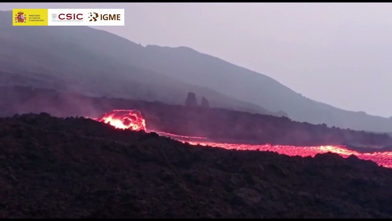 Juana Vegas, geóloga del IGME nos describe cómo es el transporte de un bloque errático en un canal lávico en la zona de Las Manchas. Las zonas más fundidas del bloque toman colores más encendidos (amarillo brillante casi blanco) y las partes más frías (más oscuras) se localizan en la parte superior o más alejadas de la fuente de calor.
