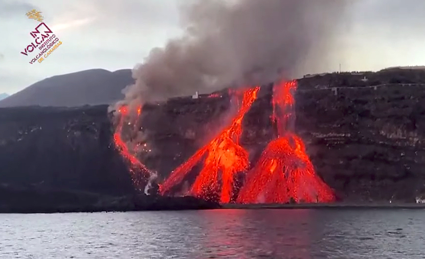 La colada 2 llevaba un mes parada pero en las ultimas 24 horas ha recorrido los últimos 300 metros hasta el acantilado. Ha terminado de arrasar plataneras y también alguna edificación, generando una columna de gases por momentos muy densa. La lava cae de forma continua por el acantilado como una cortina que cubre toda la roca de material incendescente. El flujo de la colada primigenia, que durante semanas parecía parada, pero que en realidad estaba fluyendo por tubos hasta ha aflorado, ahora parece que es la que mas avanza. Si sigue con esta fuerza, se ampliará la primera fajana. Si la primera ya enterró una parte de la playa de Los Guirres, este avance podría ser la que lo que la entierre por completo.