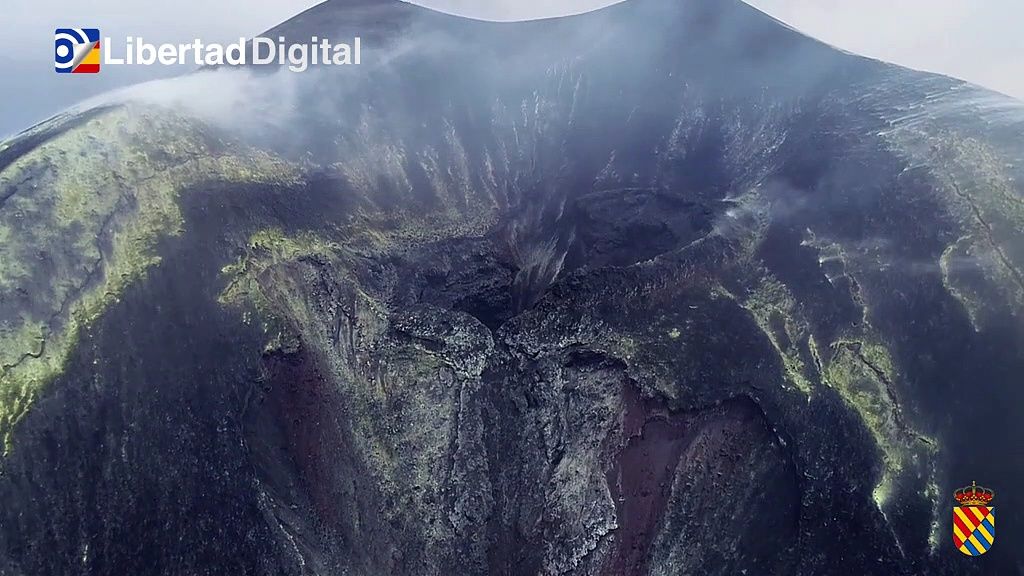 Reconocimiento de un dron de la UME, en el que se puede observar el estado del cono principal. Se aprecia el cese de actividad en su centro emisor relacionado con la fisura de su cara oeste, cuyos centros emisores concentran en estos momentos la actividad.