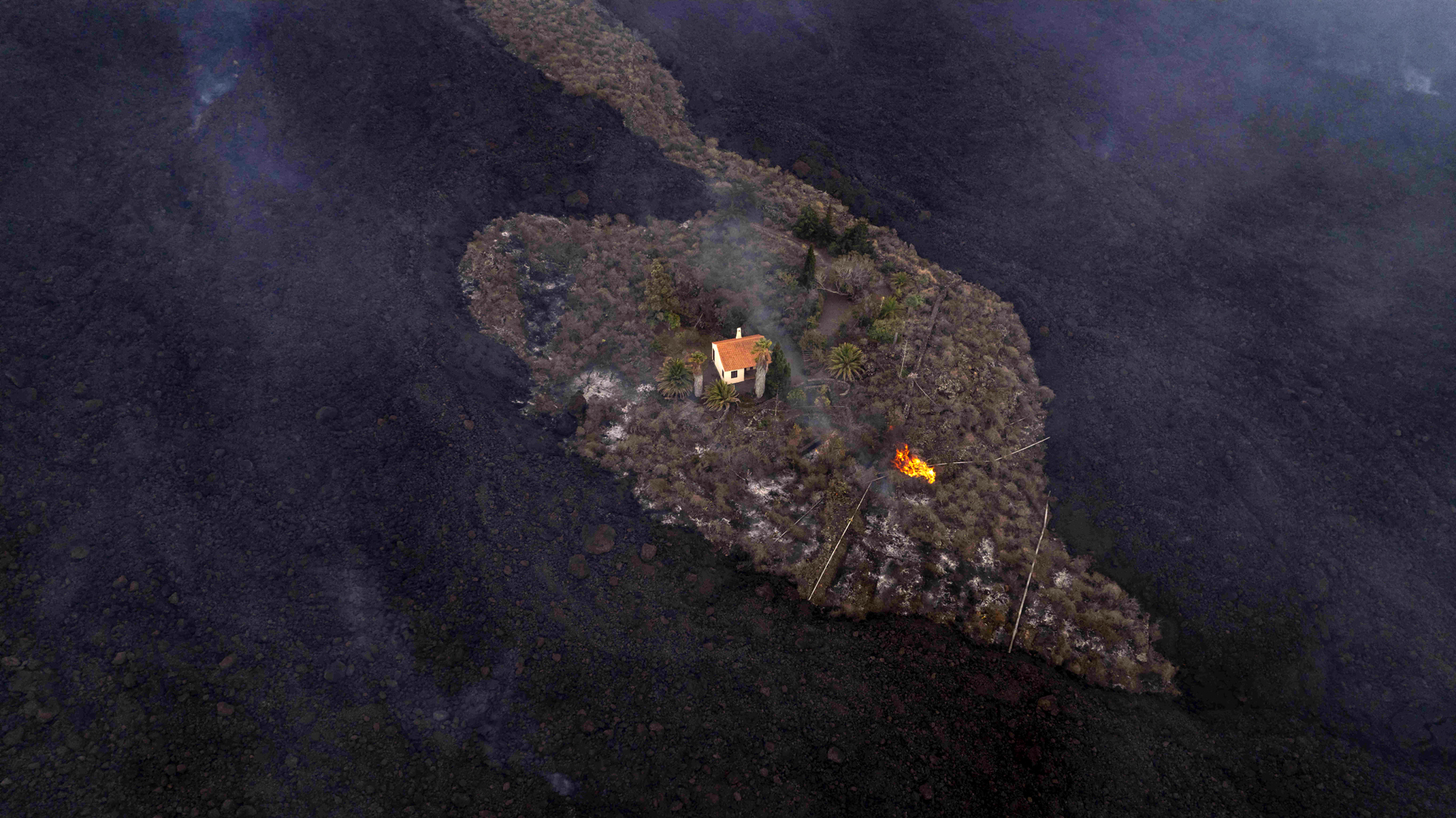 A pesar de que muchas viviendas han sido cubiertas por la lava y completamente destruidas, otras, como esta de la foto, se han salvado.