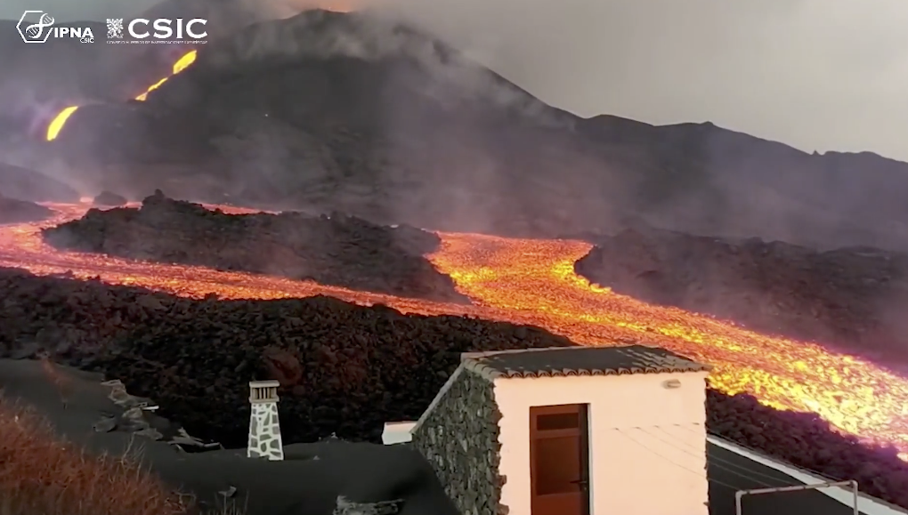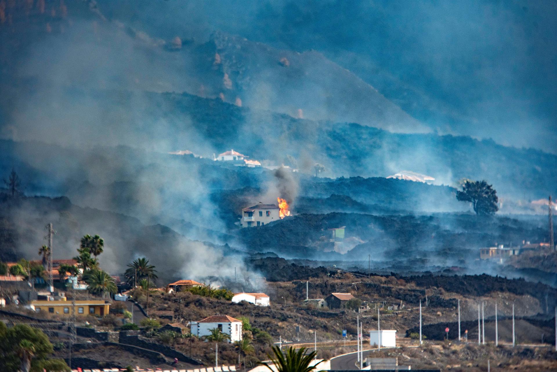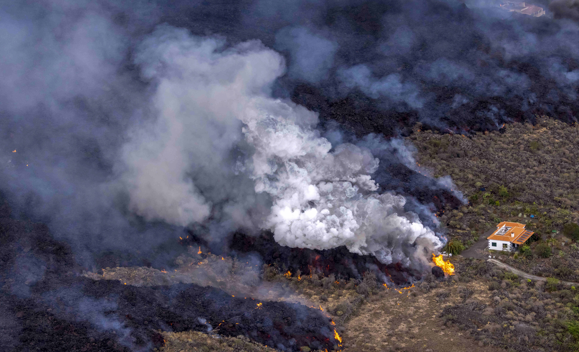 Una vista aérea de la lava a punto de engullir completamente una casa en La Palma.