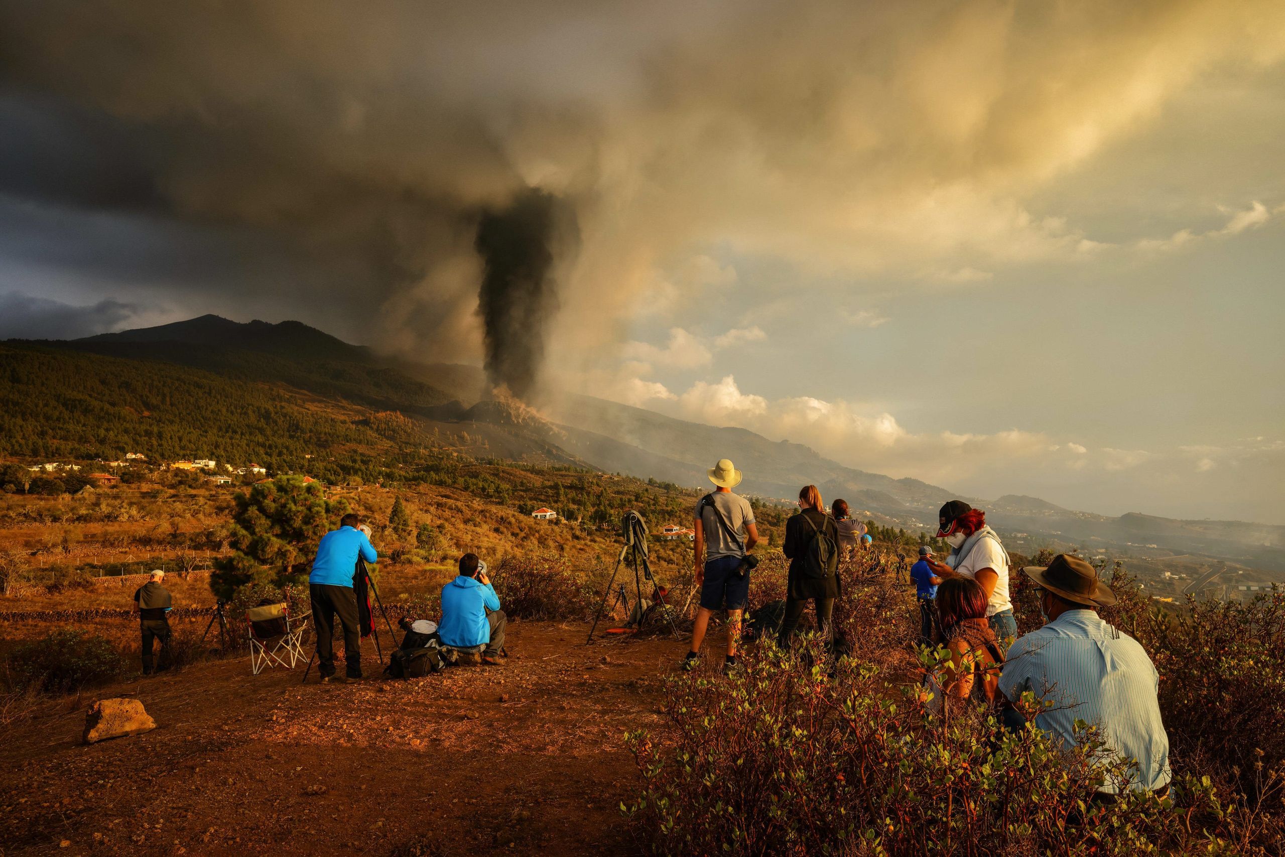 Un grupo de personas observa desde lejos la erupción en La Palma.