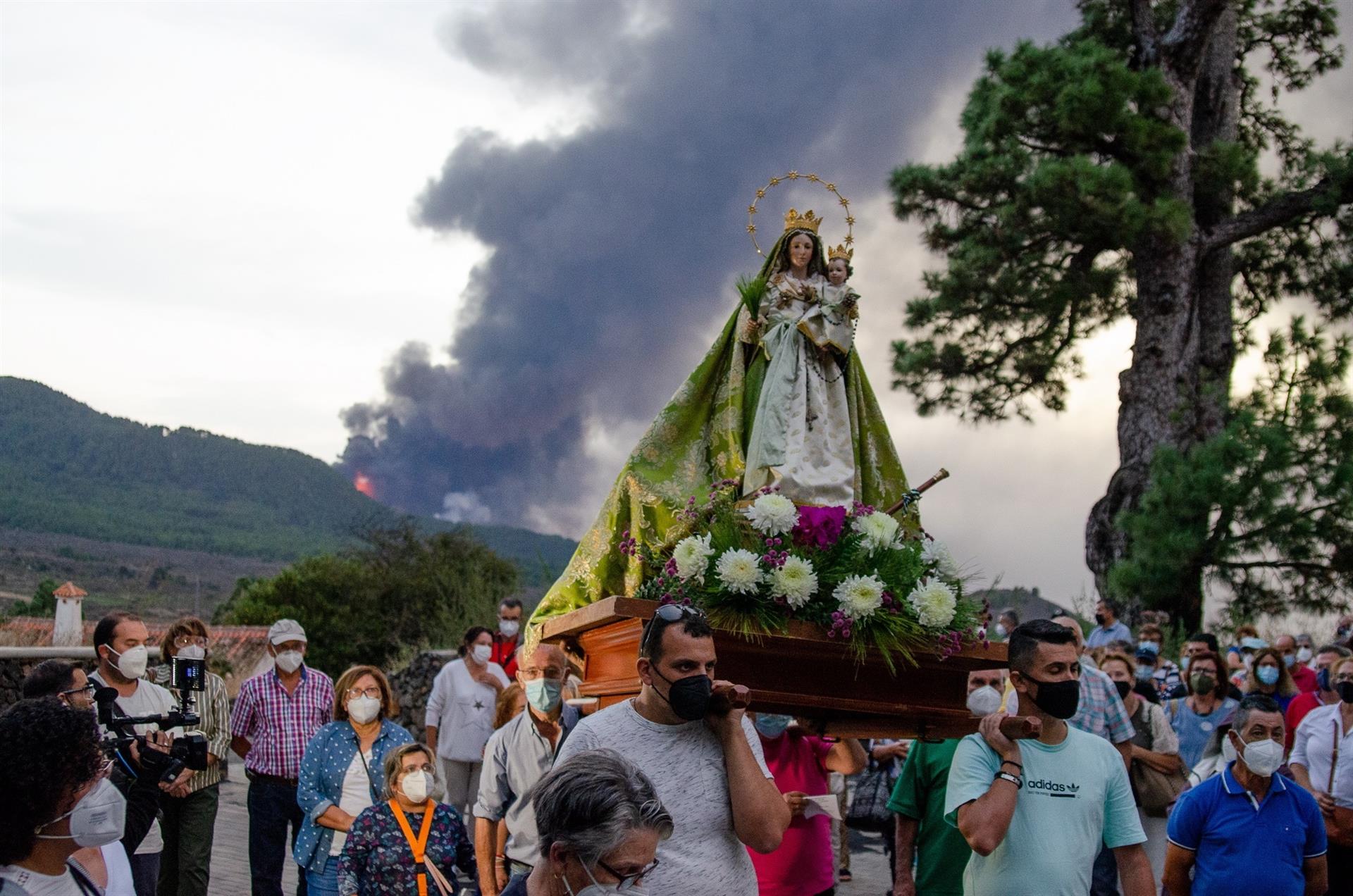 Procesión de la Virgen del Pino, en El Paso, con el volcán al fondo, para pedir su intercesión en favor del cese de la acción devastadora de este volcán cuando se cumple un mes de la erupción del Cumbre Vieja.