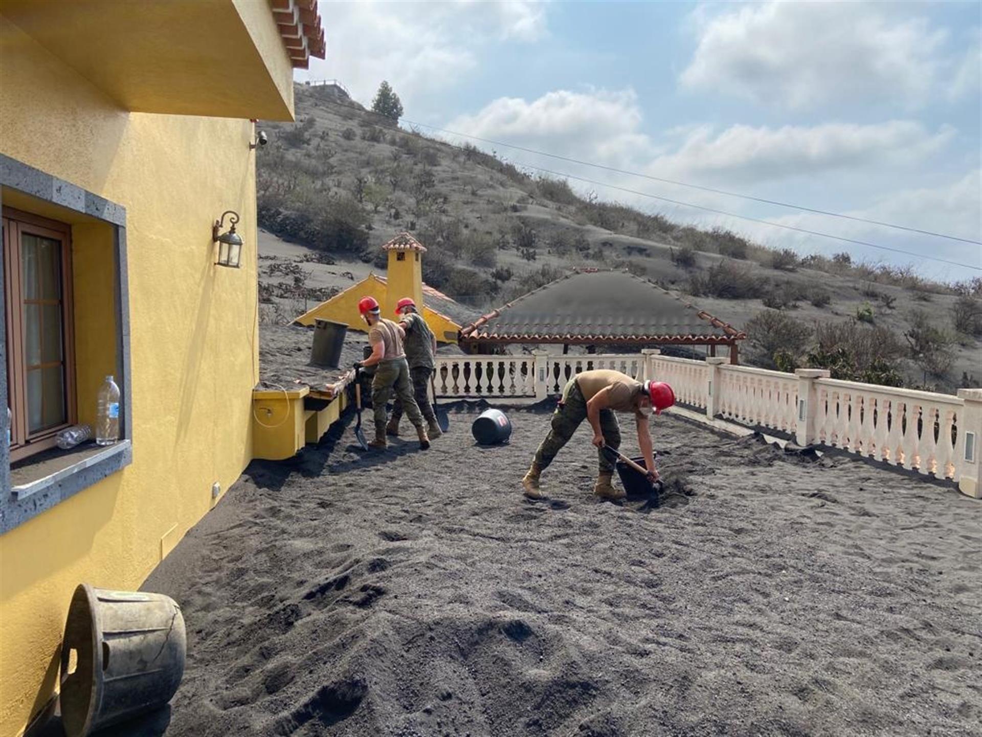 Efectivos del Ejército de Tierra durante las tareas de retirada de cenizas de tejados y azoteas en La Palma.
