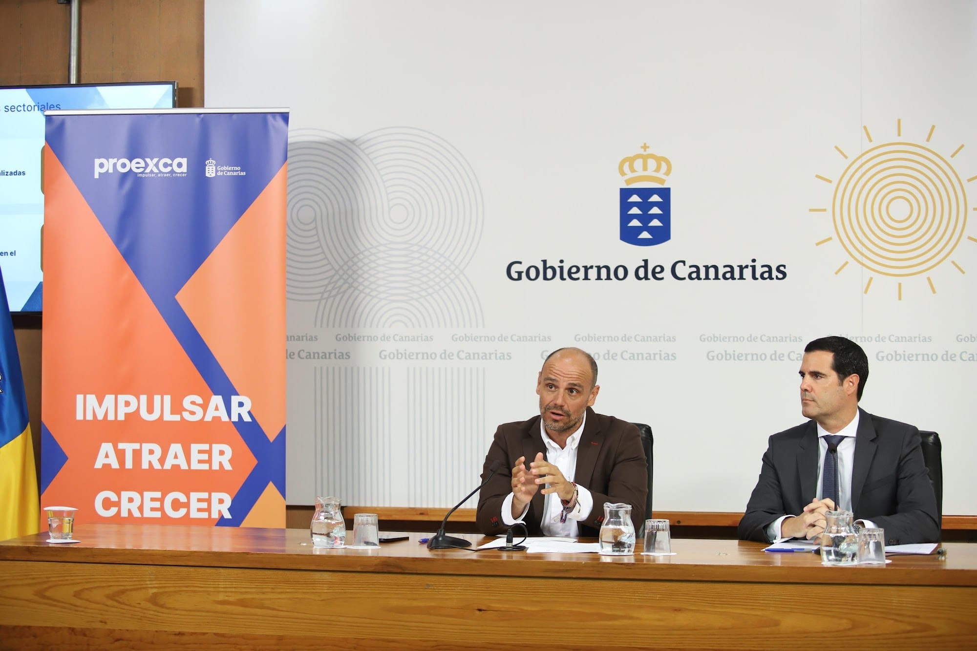 El viceconsejero de Presidencia del Gobierno de Canarias y presidente de Proexca, Alfonso Cabello, y el vicepresidente de Economía e Internacionalización y vicepresidente de Proexca, Gustavo González de Vega, presentaron el pasado viernes en la sede de Presidencia de Santa Cuz de Tenerife, los indicadores de 2023. Los datos se analizaron por las tres áreas de actuación en las que trabaja Proexca: promoción exterior, invertir en Canarias y formación.