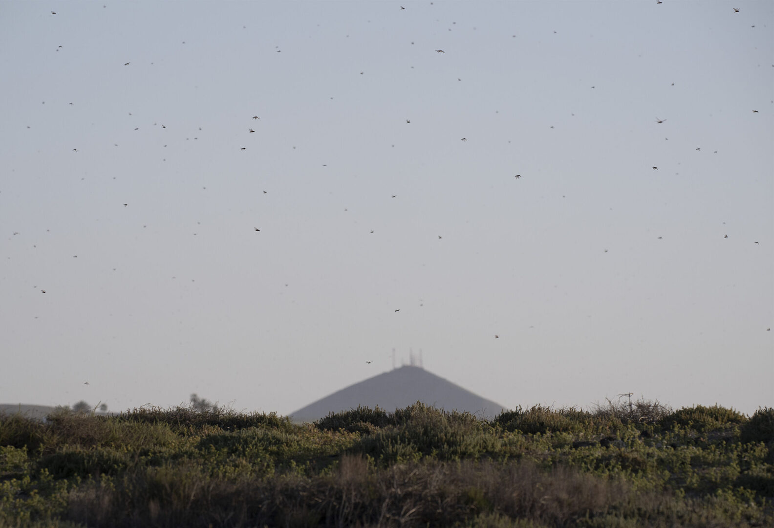 La calima intensa y el fuerte viento de componente sahariano que afectan estos días a Lanzarote han dejado una imagen poco habitual en la isla: la llegada de un enjambre de langostas, arrastrado desde el continente africano por las corrientes de aire. Un fenómeno que, aunque no es completamente nuevo, sí genera preocupación, especialmente en el sector agrícola. Y es que, según los especialistas, las próximas cuarenta y ocho horas serán clave