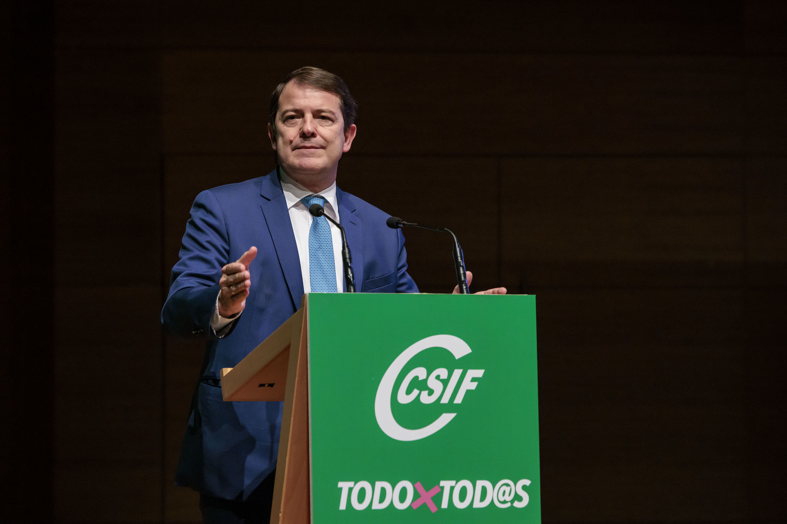 El presidente de la Junta de Castilla y León, Alfonso Fernández Mañueco, ha participado en Valladolid en la clausura del VIII Congreso Autonómico de la Central Sindical Independiente y de Funcionarios (CSIF). Durante su intervención, ha subrayado su compromiso de mantener un diálogo abierto con las organizaciones sindicales para llegar a acuerdos que mejoren las condiciones laborales de los empleados públicos, ya que son ellos precisamente los principales responsables de que los servicios públicos de Castilla y León estén a la cabeza a nivel nacional.