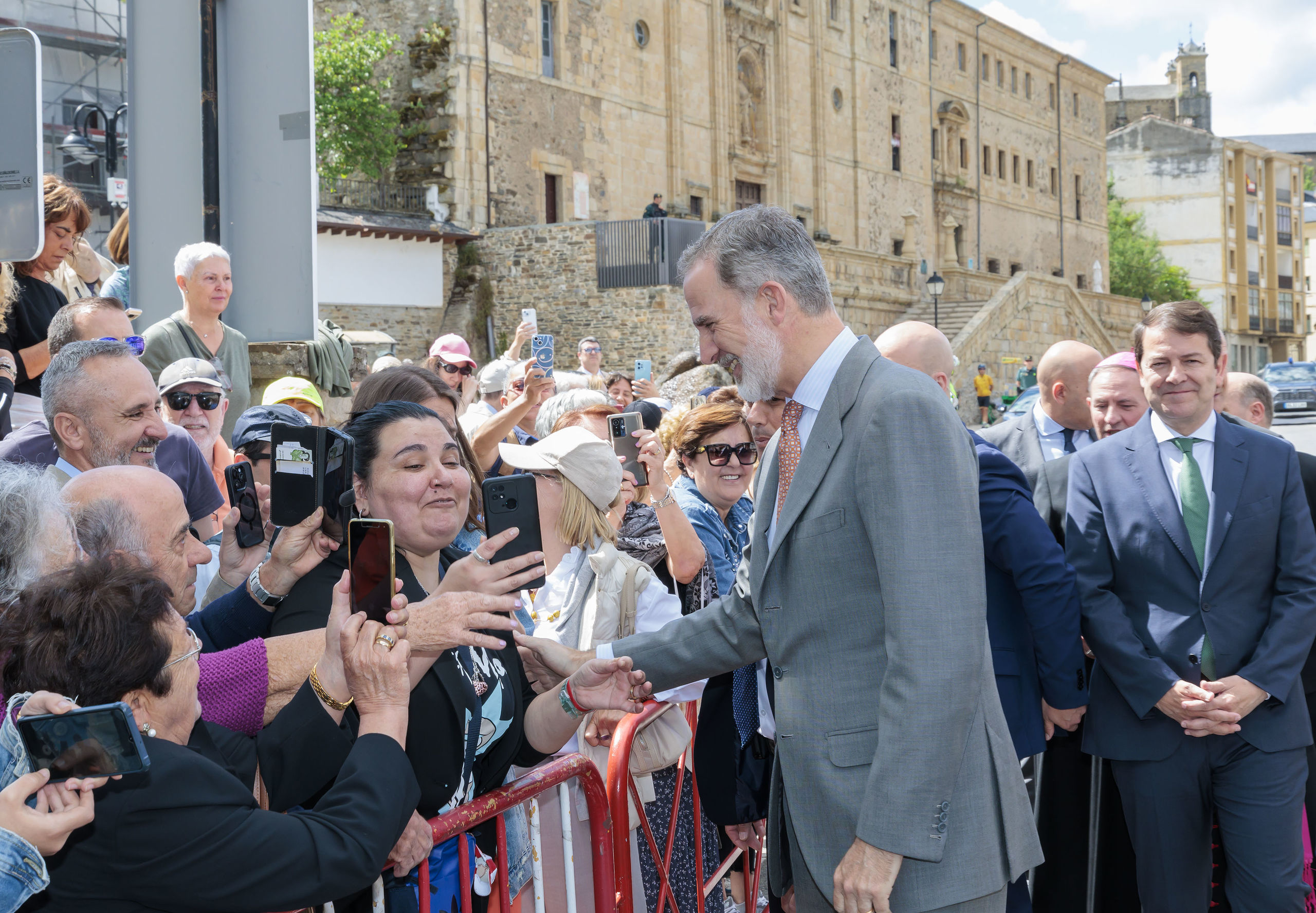 Felipe VI llegó en coche a la villafranquina Iglesia de Santiago Apóstol, donde se dirigió a la Puerta del Perdón, por la que los peregrinos que no podían llegar a Santiago por encontrarse enfermos, obtenían la misma indulgencia que la que otorgaba su homóloga compostelana. Posteriormente el monarca pasó a la Colegiata de Santa María, la otra ubicación de la exposición en su sede berciana, donde saludó a cientos de personas que aguardaban su llegada.