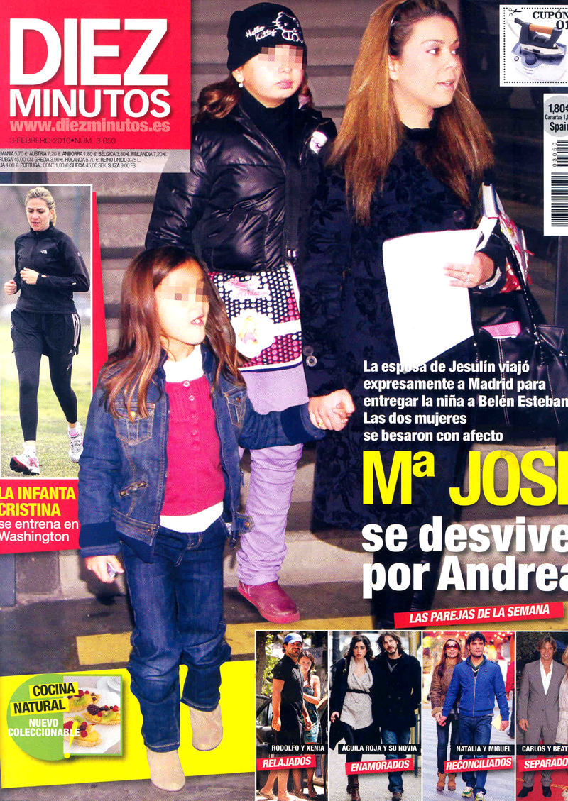 La foto de María José Campanario con su hija Julia y Andreía momentos antes de reunirse con Belén Esteban se lleva todo el protagonismo en Diez Minutos. Otros asunto de portada son la infanta Cristina haciendo deporte en Washington y algunas de las parejas del panorama nacional.