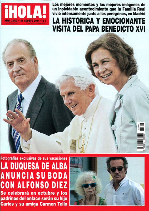 La visita de Benedicto XVI y el anuncio de la boda de la Duquesa de Alba son los temas de la portada de la revista ¡Hola!. Extenso reportaje de Benedicto XVI en Madrid con unas impresionantes imágenes.