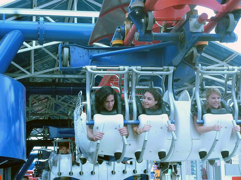 Y para colmo va tu hermana y se anima, aunque tenía miedo de arrojar los perritos calientes ingeridos. Hay que ver la cara de felicidad que tenéis.