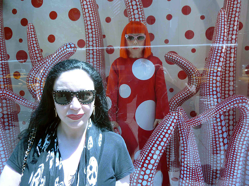 En la Quinta Avenida nos topamos con el maravilloso escaparate de Louis Vuitton con la colección de la artista Yayoi Kusama, y tenemos la duda de si en la puerta nos tropezamos con Priscilla Presley.