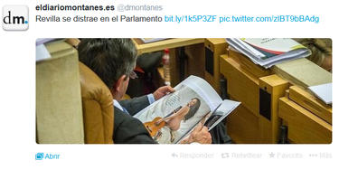 Tuit de Diario Montañés con la imagen de Revilla. Dice que quería leer sobre Blesa Revilla, cazado en el Parlamento cántabro viendo 'Interviú' 20 comentarios