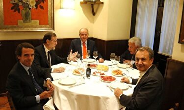 El rey emérito y los cuatro presidentes de España | Twitter La "agradable" cena de Juan Carlos con los presidentes Se reunieron en Casa Lucio. La idea fue de Mariano Rajoy que organizó y cuadró las agendas de los comensales.