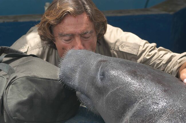 El aventurero, besando un manatí | Cordon Press Lo que tuvo que comer De la Quadra-Salcedo Manuel Román ¿Qué manjares comió uno de los españoles que más viajó a lugares remotos durante su vida? Muere Miguel de la Quadra-Salcedo a los 84 años