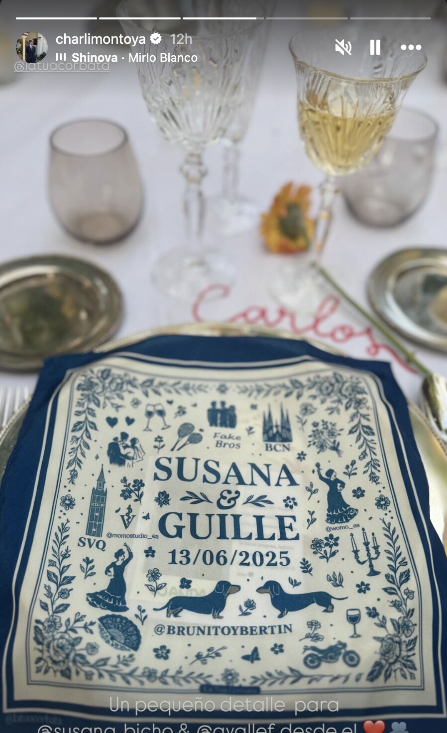 "Un pequeño detalle para Susana y Guille desde el corazón", ha escrito en su cuenta de Instagram. Un pañuelo con los nombres de los novios, la fecha del ‘sí, quiero’ rodeado de una simbología que claramente representa su vínculo con los protagonistas del día. Perros, una flamenca, una moto, una copa de vino y la Giralda de Sevilla.