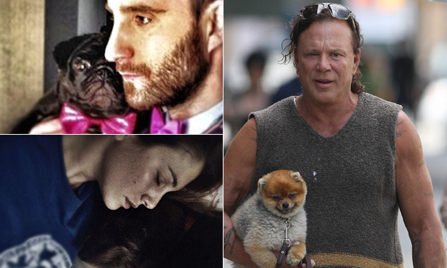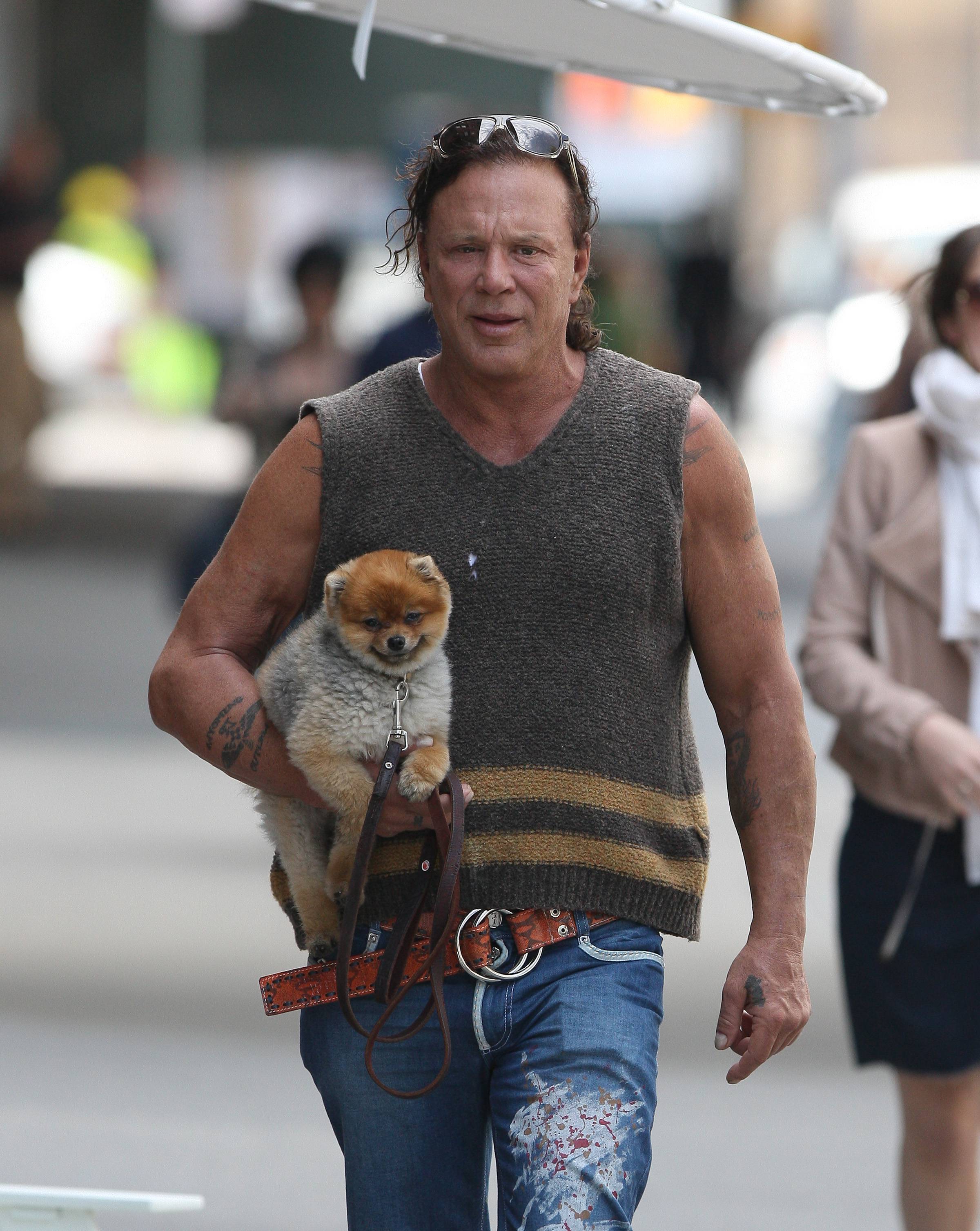 El perro que lleva en brazos Mickey Rourke es sólo uno de los 4 que viven con él. Hace 5 años perdió a su chihuahua Loki, a la que quería especialmente y con la que vivió 18 años. Dice el actor que sus perros fueron su salvación y son su terapia. El que vemos en la imagen es Tango.
