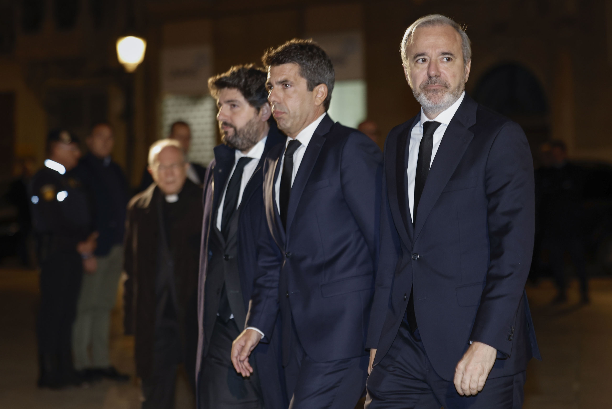 Los presidentes de Murcia, Fernando López Miras, Valencia, Carlos Mazón y Aragón, Jorge Antonio Azcón, a su llegada al funeral por las víctimas de la DANA celebrado este lunes en la catedral de Valencia.