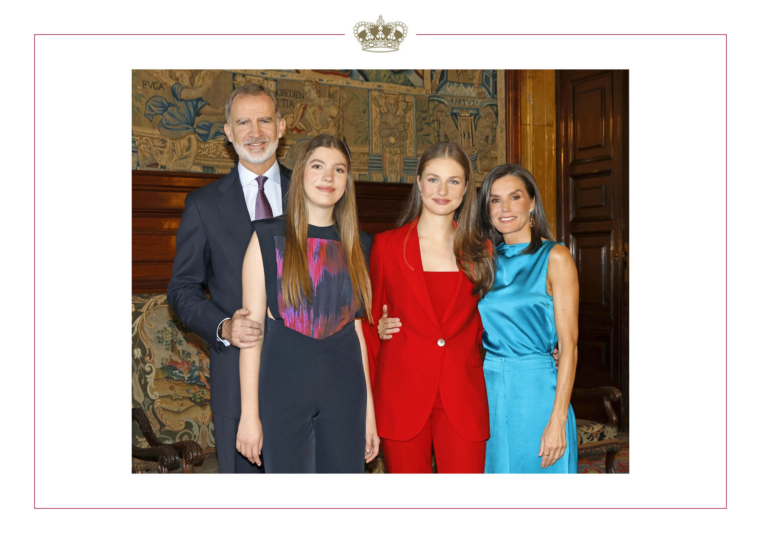 La felicitación de 2024 que la Casa Real divulga en vísperas de la Navidad para felicitar las fiestas y el nuevo año abre con una foto de Felipe VI, la reina Letizia, la princesa Leonor y la infanta Sofía, obtenida en el Palacio Real y no publicada hasta ahora. Se trata de una imagen que se tomó después de presidir el relevo solemne de la Guardia Real con el que se iniciaron el 19 de junio de este año las actividades conmemorativas del X Aniversario de proclamación del Rey.