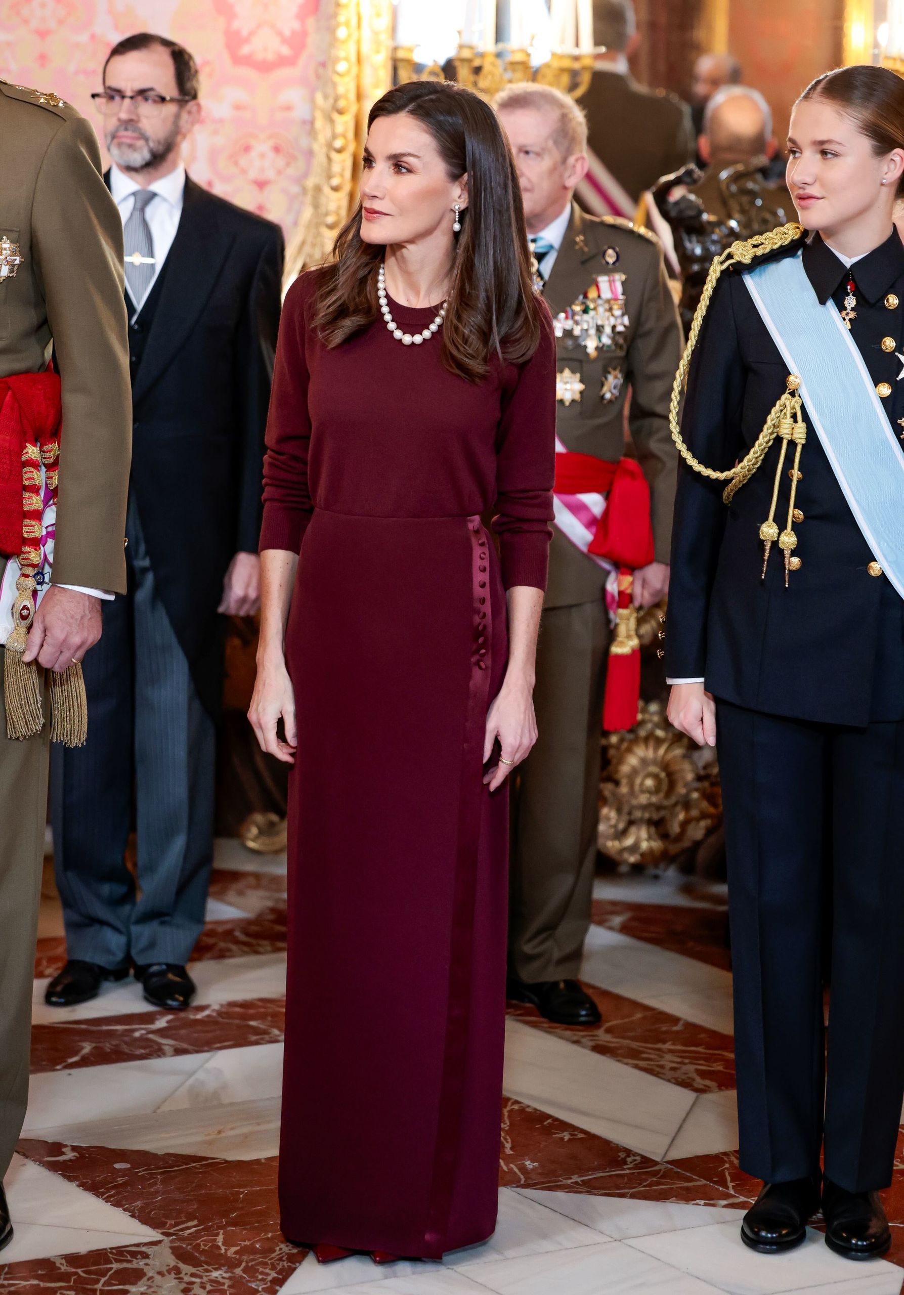 Tal y como dicta el protocolo del acto, Doña Letizia ha optado por un conjunto en el color tendencia de la temporada, el burdeos, formado por una falda recta con ribetes en satén a tono con botonadura forrada y abertura frontal tipo wrap, que estrenó en la recepción al Cuerpo Diplomático en 2019, con un jersey de cashmere de la firma italiana Falconeri. Como joyas, destacaban pendientes de perlas australianas con diamante en la parte superior y el valioso collar de 37 perlas pertenecientes al lote de joyas de pasar. En cuanto al resto de complementos, llevó zapatos de tacón sensato y clutch a juego de Magrit.
