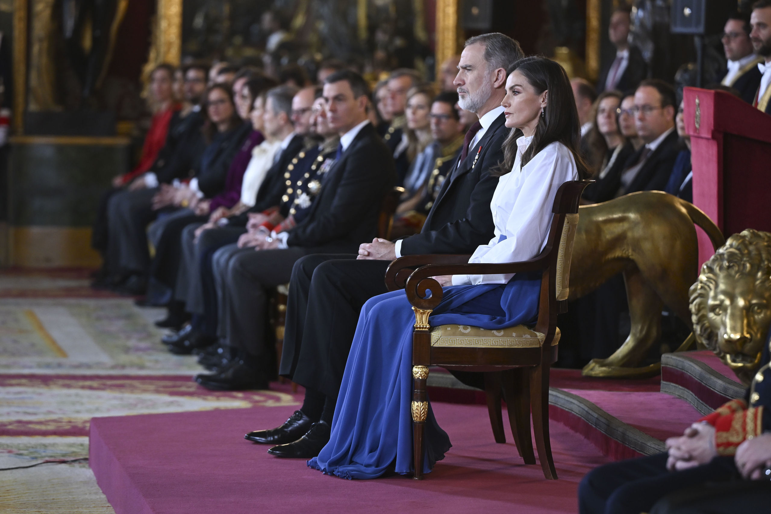 Cumpliendo con el protocolo de vestimenta que marca el acto, Don Felipe ha lucido un impecable chaqué, con chaleco negro y corbata en color burdeos mientras que Doña Letizia ha lucido un look muy parecido al que ya elegió en 2023, compuesto con falda larga azul y blusa blanca de manga japonesa de The 2nd Skin y que estrenó el pasado diciembre durante su visita de Estado a Italia, concretamente en Nápoles. Como complementos, ha lucido los pendientes en forma de lágrima de diamantes y zafiros.