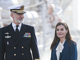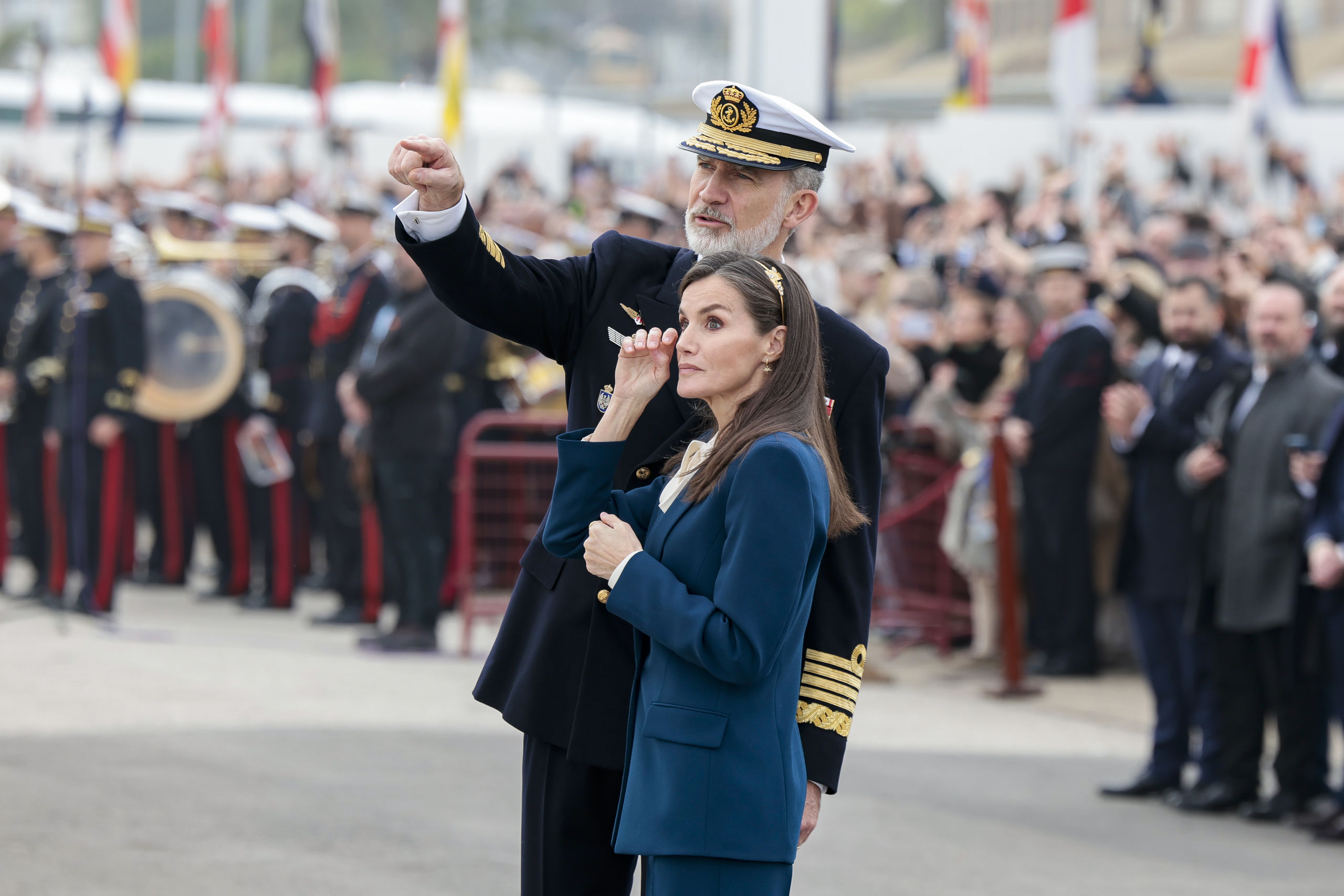 Mientras que Don Felipe ha vestido uniforme de capitán general de la Armada, doña Letizia ha optado por un traje elegante azul petróleo formado por pantalón y americana, con blusa en color crema con lazada de Carolina Hererra y mocasines de Massimo Dutti. Han llamado la atención los complementos del look de la Reina formado por una diadema dorada con ornamento en forma de hoja y remates brillantes en uno de los laterales y pendientes dorados con forma de estrella de ocho puntas, a imitación de una brújula, de la joyera mallorquina Isabel Guarch.
