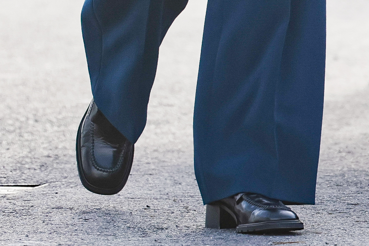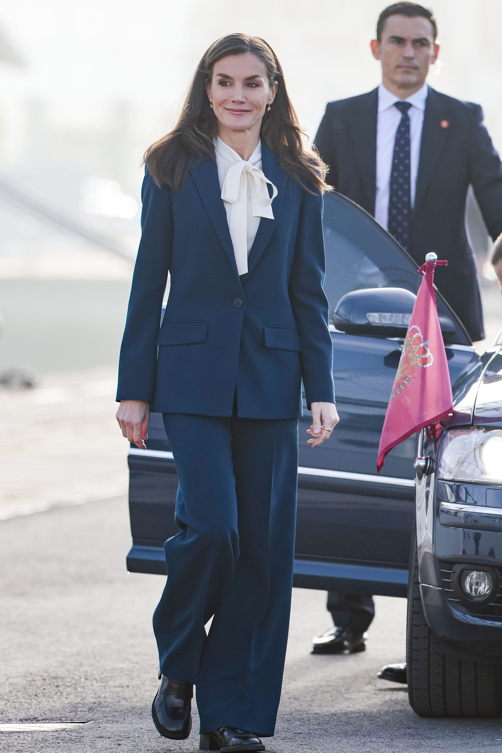 Ya sabemos los problemas que sufre Letizia en sus pies, por este motivo ha optado por la comodidad con unos mocasines negros de tacón ancho y altura media. Esta opción le ha permitido desplazarse con facilidad por el puerto.