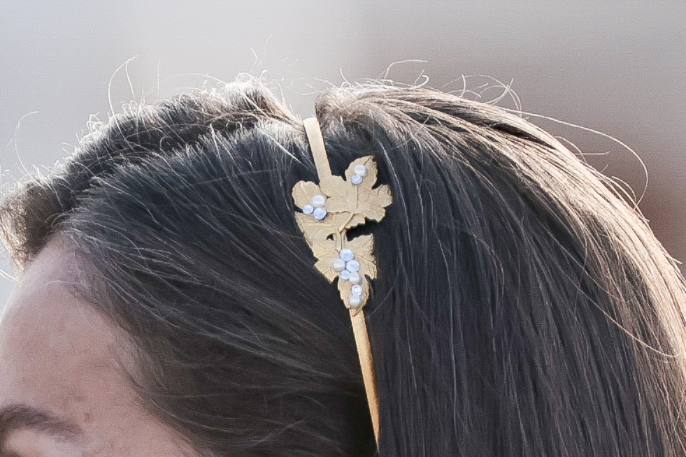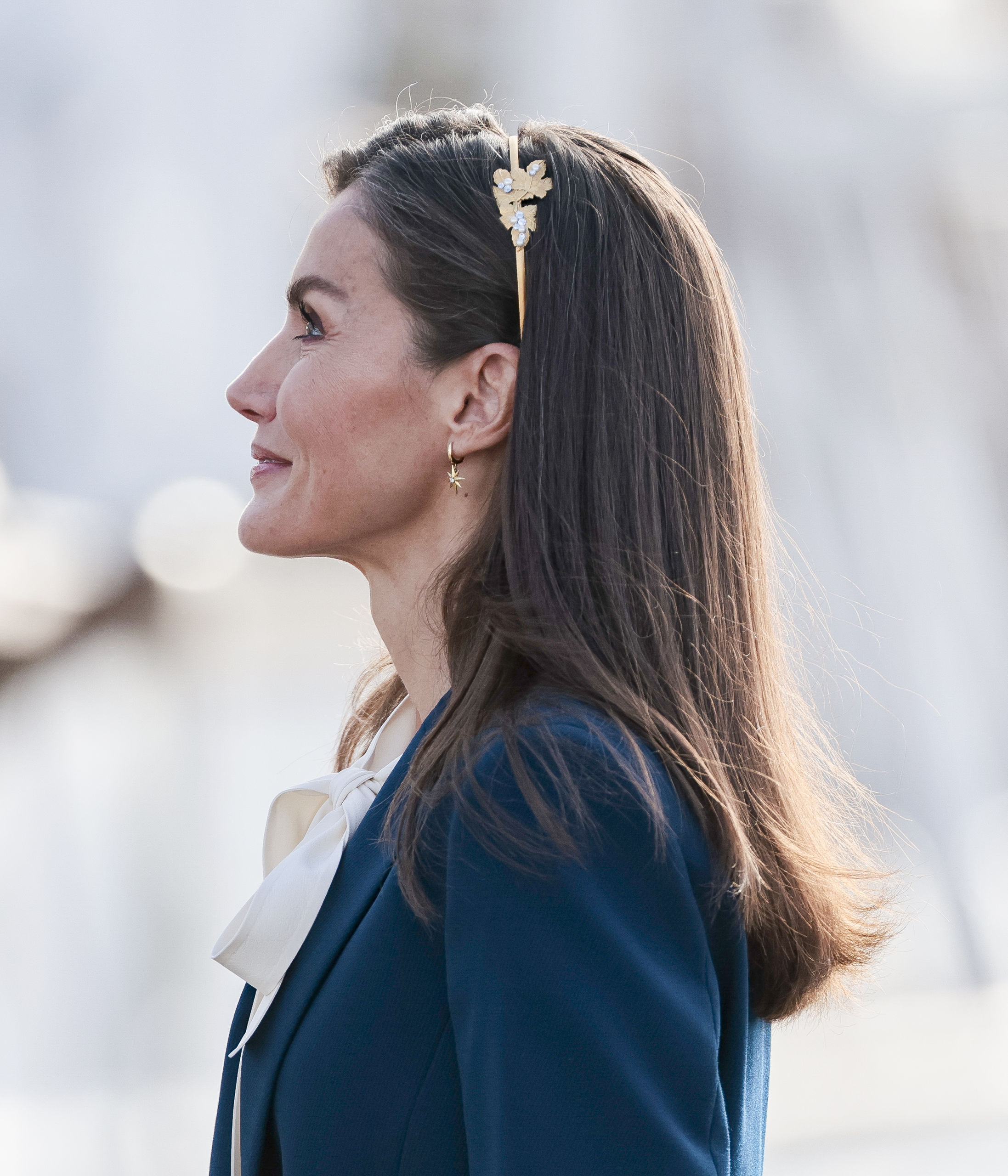 No es habitual que la reina Letizia utilice accesorios en su cabeza en eventos de este tipo. Sin embargo hoy ha lucido una diadema que aportaba un toque floral al conjuntos: está compuesta por hojas en color oro y pequeñas perlas.
