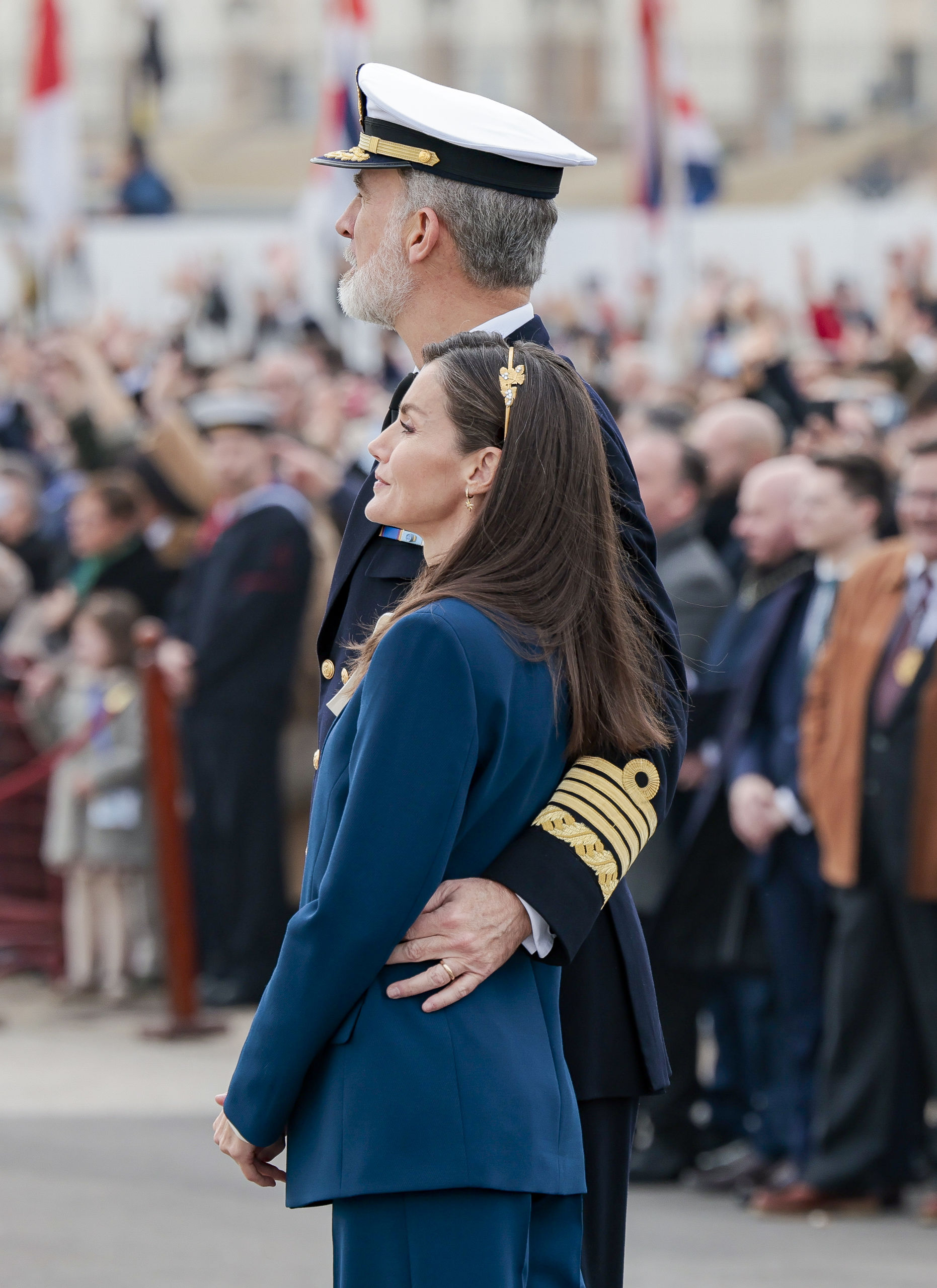 La reina Letizia ha cuidado hasta el último detalle y ha elegido el azul y el blanco en su look como homenaje al uniforme de la guardiamarina que luce su hija Leonor y el resto de sus compañeros. Un bonito gesto con el que la reina ha querido despedirse de su hija, además de crear una uniformidad en el evento que solo nuestra reina y su buena mano para la moda podrían conseguir.