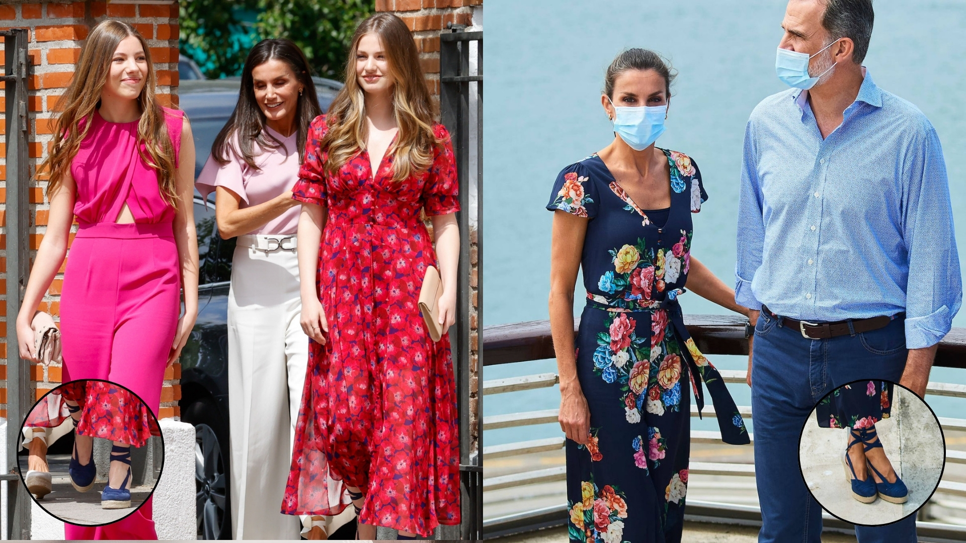 El calzado estrella en verano de la Familia Real, sobre todo en sus vacaciones en Palma de Mallorca, son las alpargatas. Se las hemos podido ver de todas las formas y colores, con más tacón, con menos, planas, con bordados, estampados, lisas...es sin duda el favorito de la Reina y sus hijas. Las que vemos en la fotografía son unas alpargatas de cuña azul marino que se abrocha con una lazada al tobillo de la firma Calzados Picón. Se las hemos visto a Doña Letizia en multitud de ocasiones, pero la última en utilizarlas fue la princesa Leonor en la confirmación de su hermana la infanta Sofía.