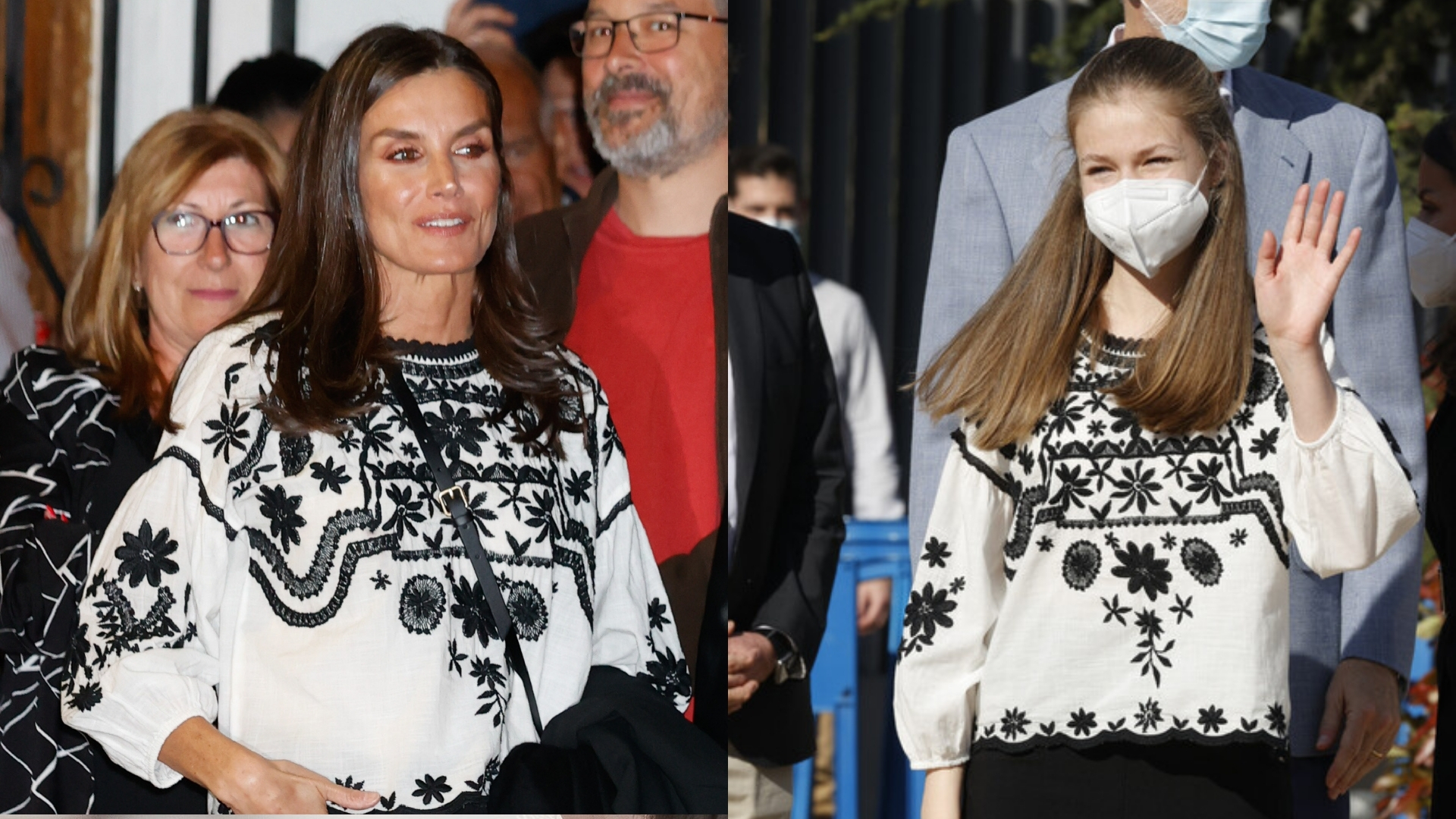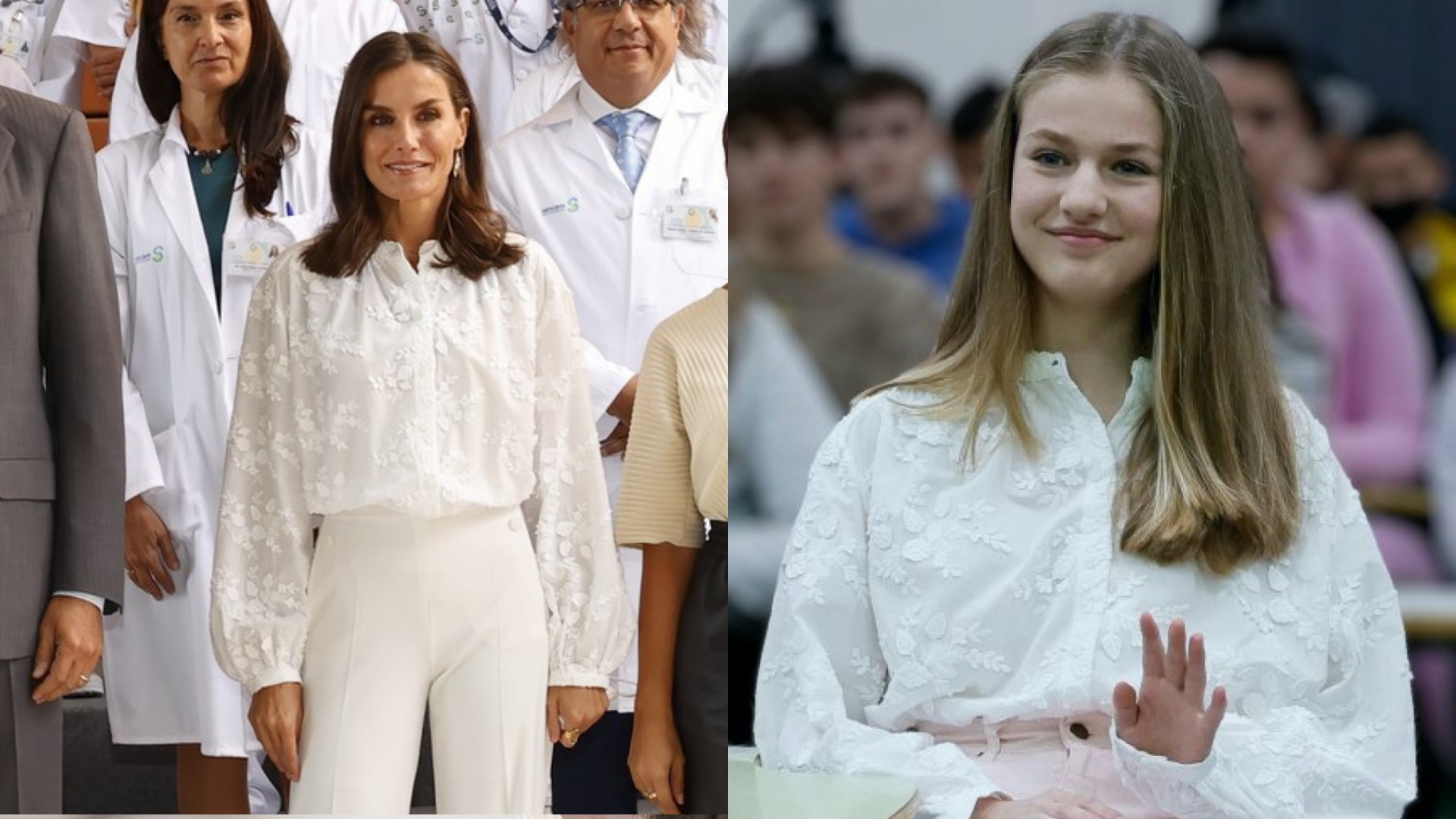 En uno de los primeros actos oficiales en solitario de la princesa Leonor, llevó una blusa blanca de mangas abullonadas, bordados florales y cuello mao que combinó, con un estilo más juvenil, con unos pantalones rosa pastel y zapatillas blancas. Esa misma blusa la volvimos a ver unos meses después de la mano de la Reina Letizia, en la inauguración de la ampliación del Hospital Universitario de Guadalajara.