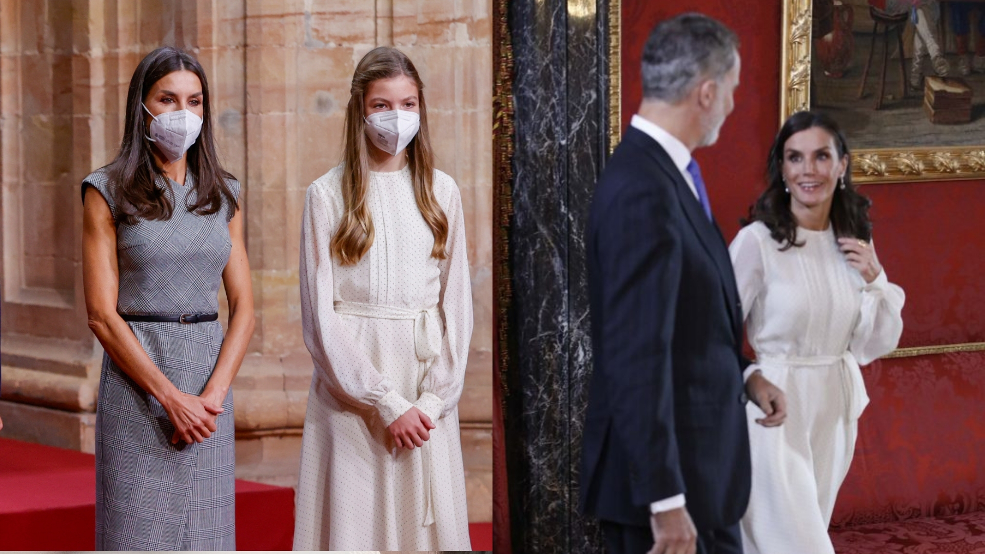 En las audiencias de los Premios Princesa de Asturias 2021, la infanta Sofía llevó un precioso vestido blanco de Carolina Herrera con un estilo muy romántico de mangas abullonadas de corte midi y un cinturón blanco a juego que ajusta en la cintura. Unos años después, la Reina fue a un almuerzo en el Palacio Real con el mismo vestido que su hija.