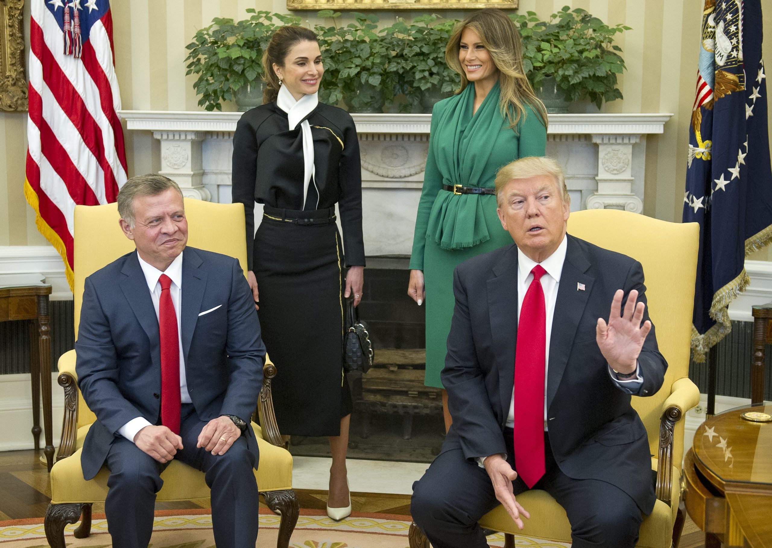 Los primeros Reyes invitados por Donald Trump y Melania fueron Abdalá y Rania de Jordania en abril de 2017. Tal y como dicta el protocolo, los Trump recibieron a los Reyes de Jordania en la puerta. Mientras Abdalá de Jordania y Donald Trump se reunían para hablar de la situación en Oriente Medio, la reina Rania y Melania Trump conversaron y dieron un paseo por los jardines de la Casa Blanca.
