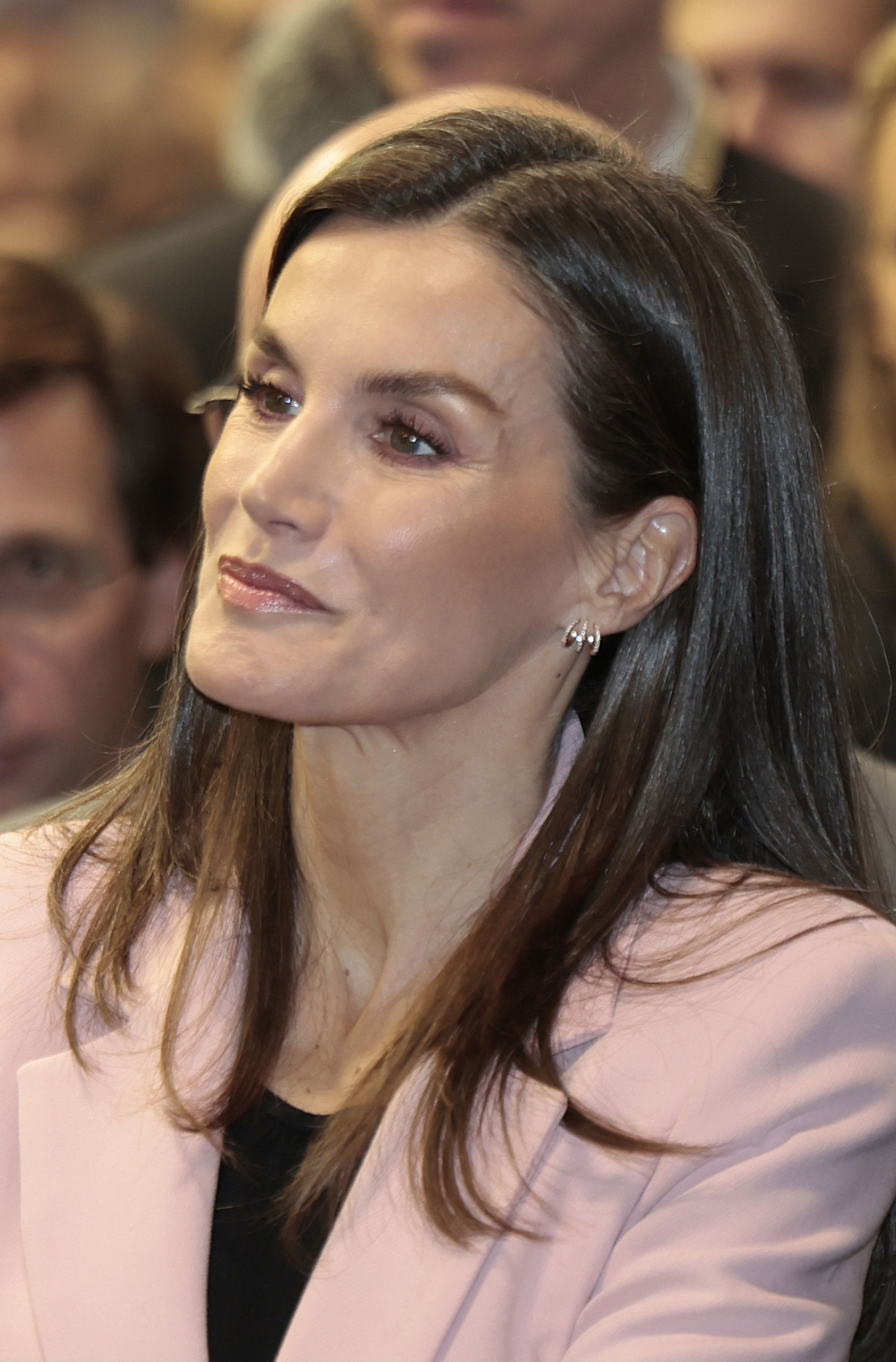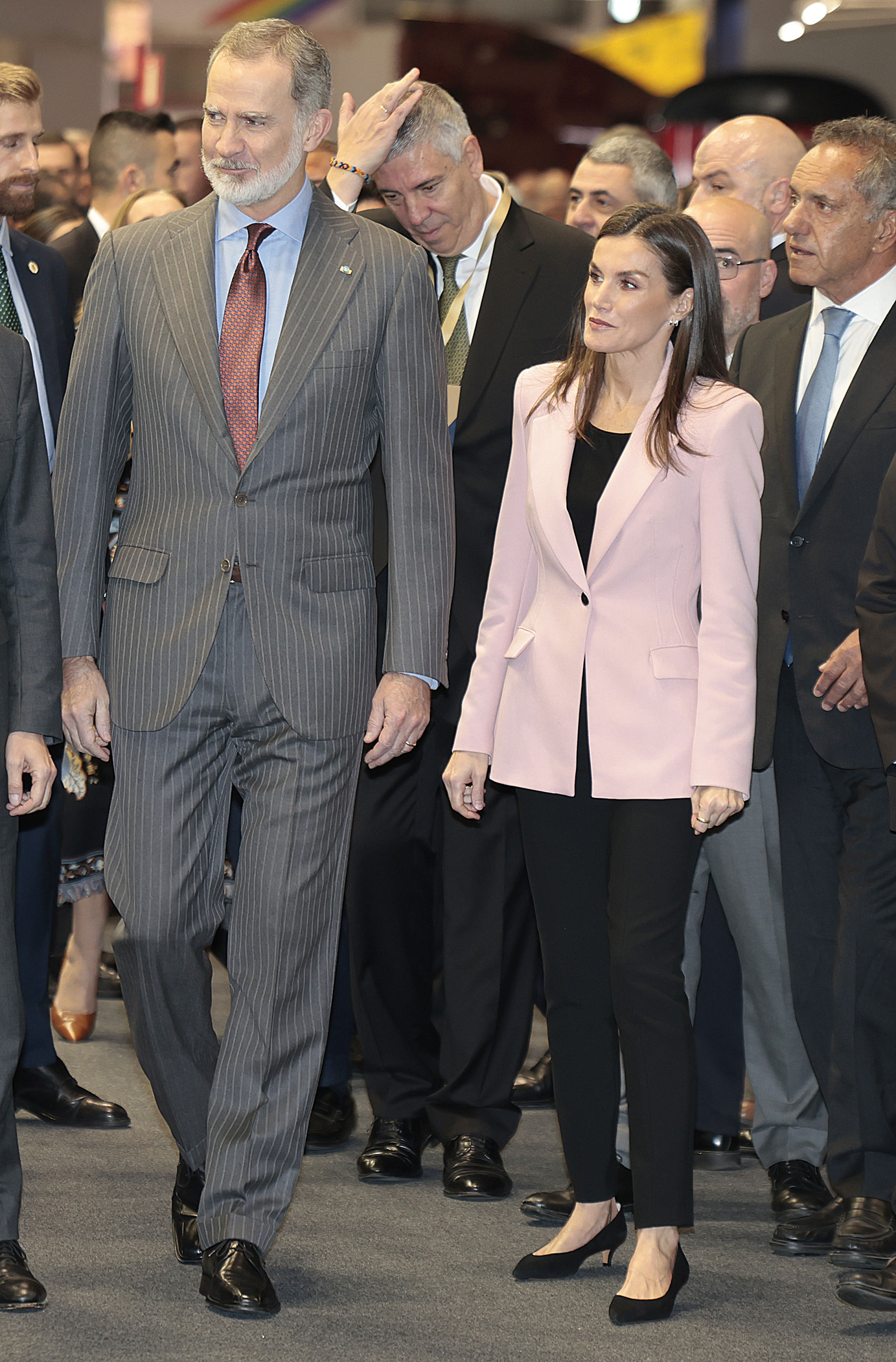 En esta ocasión, la Reina escogió un estilismo sencillo y cómodo para recorrer los pasillos de IFEMA donde destacó la blazer entallada de color rosa de Zara. La chaqueta elevaba el look sencillo formado por camiseta negra de cuello redondo y pantalones del mismo color a juego con zapatos de tacón bajo.