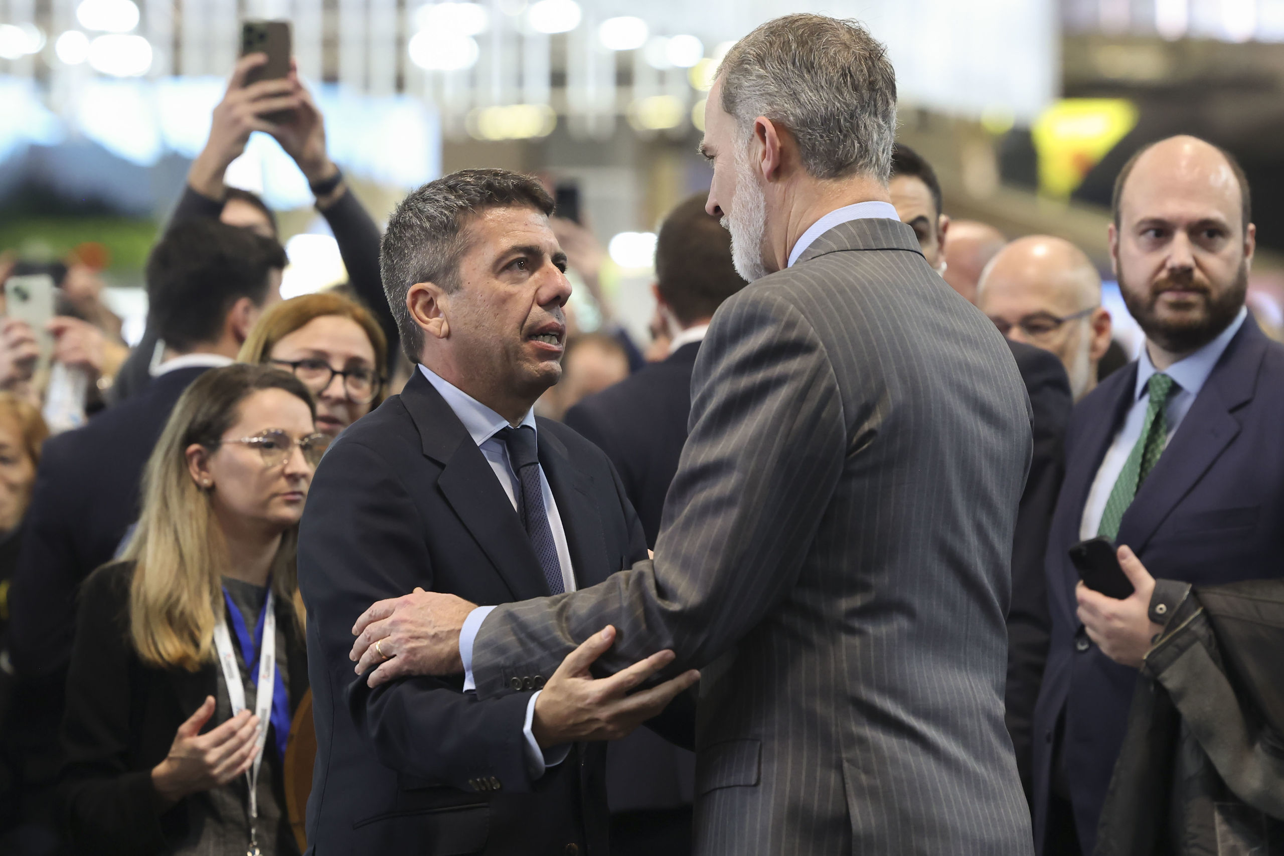 Poco después de comenzar la inauguración, los Reyes se detuvieron durante cinco minutos en el stand de la Comunidad Valenciana, donde recibieron cuatro abanicos hechos por artesanos del epicentro de la DANA por parte de Carlos Mazón, presidente de la Generalidad Valenciana.