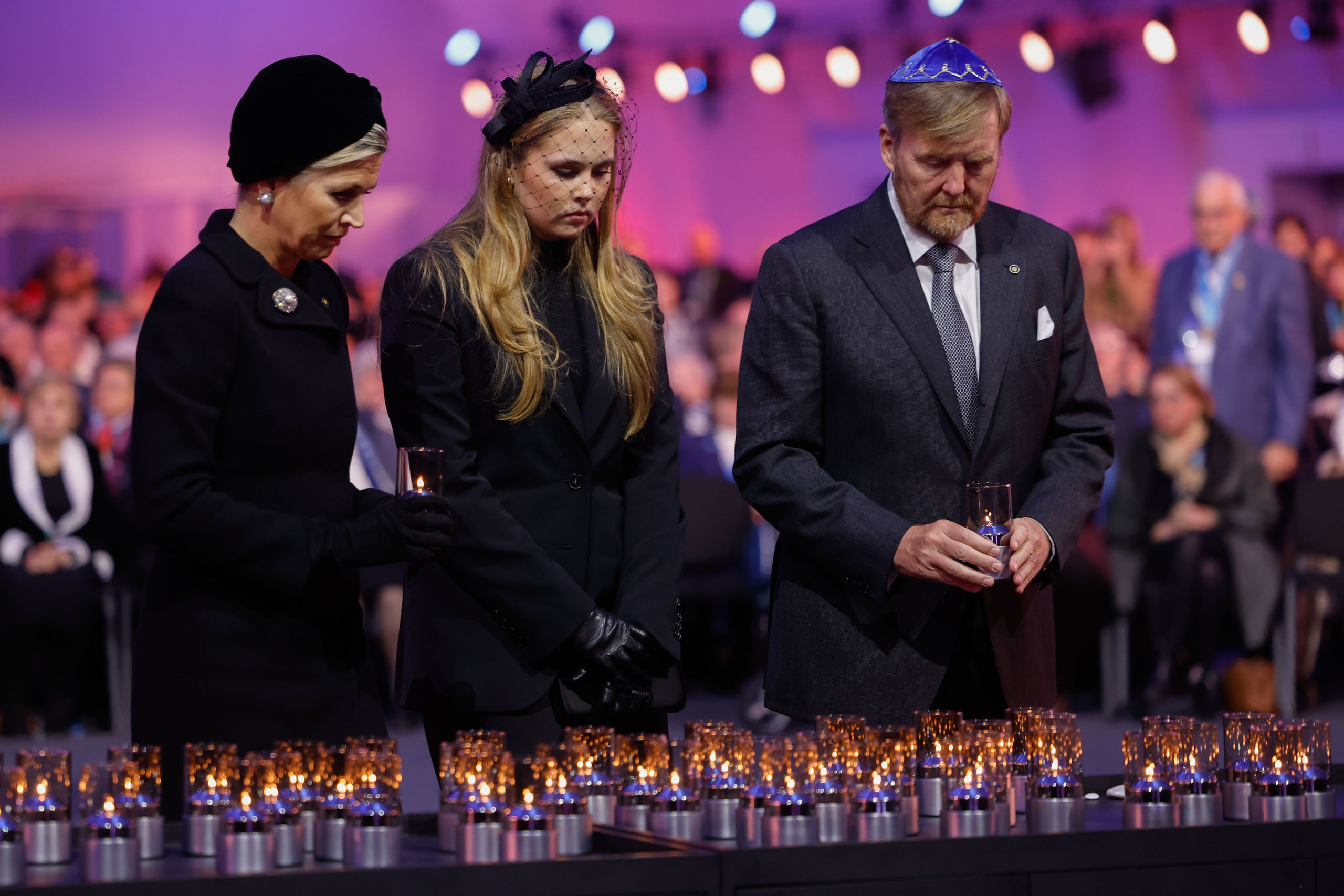 La reina Máxima, Amali, princesa de Orange y el rey Guillermo Alejandro de los Países Bajos. Como es tradición en el rey cada vez que asiste a un acto donde se homenajea al pueblo judío, ha utilizado la kippa.