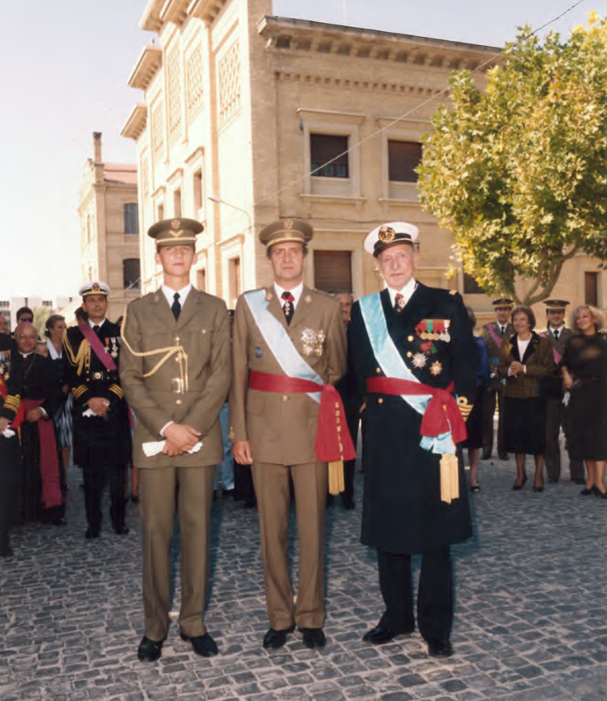 Don Felipe, acompañado de su padre y de su abuelo, en la Academia General Militar de Zaragoza, donde ingresó el 2 de septiembre de 1985 y juró bandera el 11 de octubre de 1985, en la que besó la bandera que en su día bordó su tatarabuela, la Reina María Cristina. Sus compañeros lo apodaron Winston, ya que era "rubio y muy alto".
