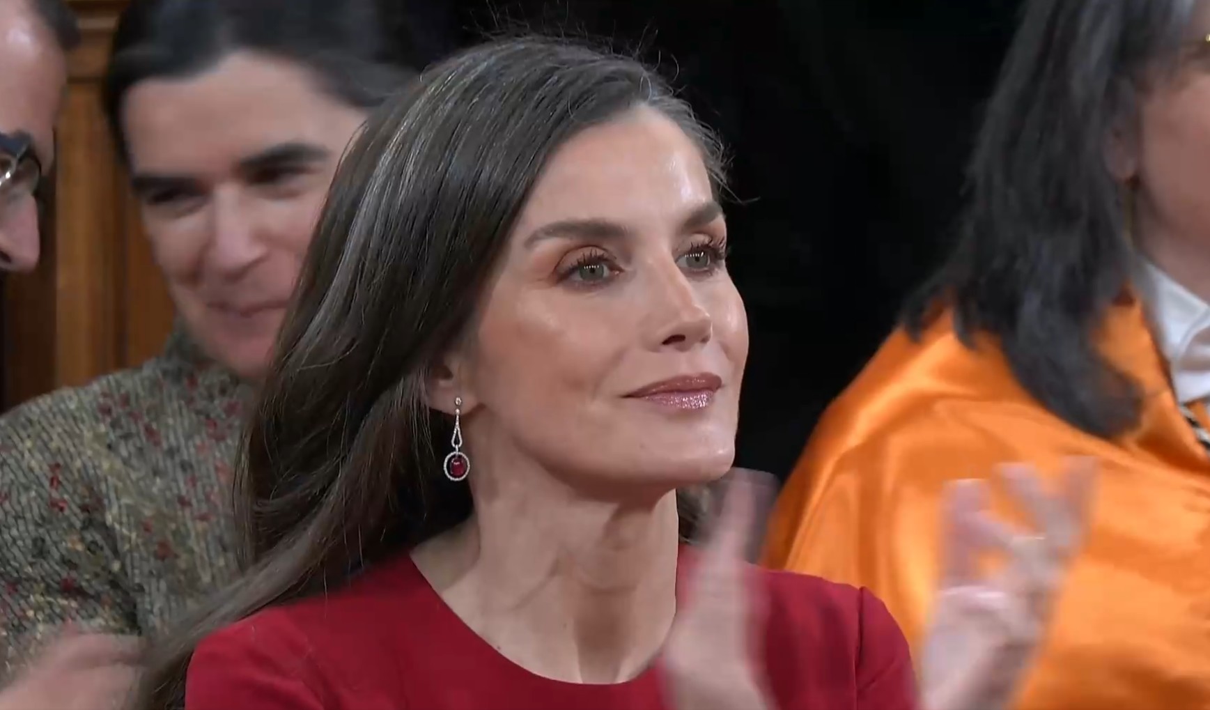 La Reina ha aprovechado la ocasión para ir a juego con el Rey con un elegantísimo vestido rojo que combinó con una capa negra de Carolina Herrera.