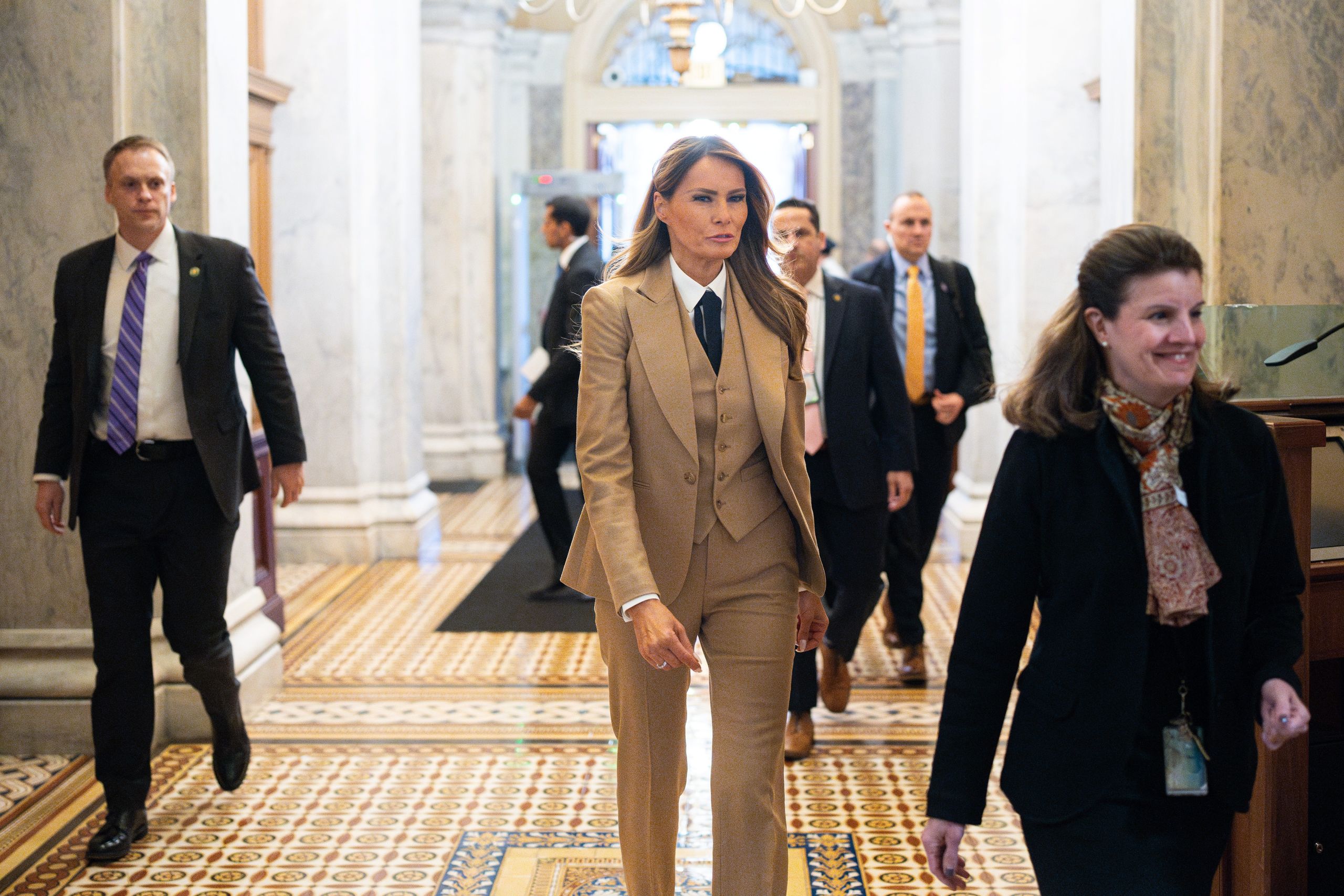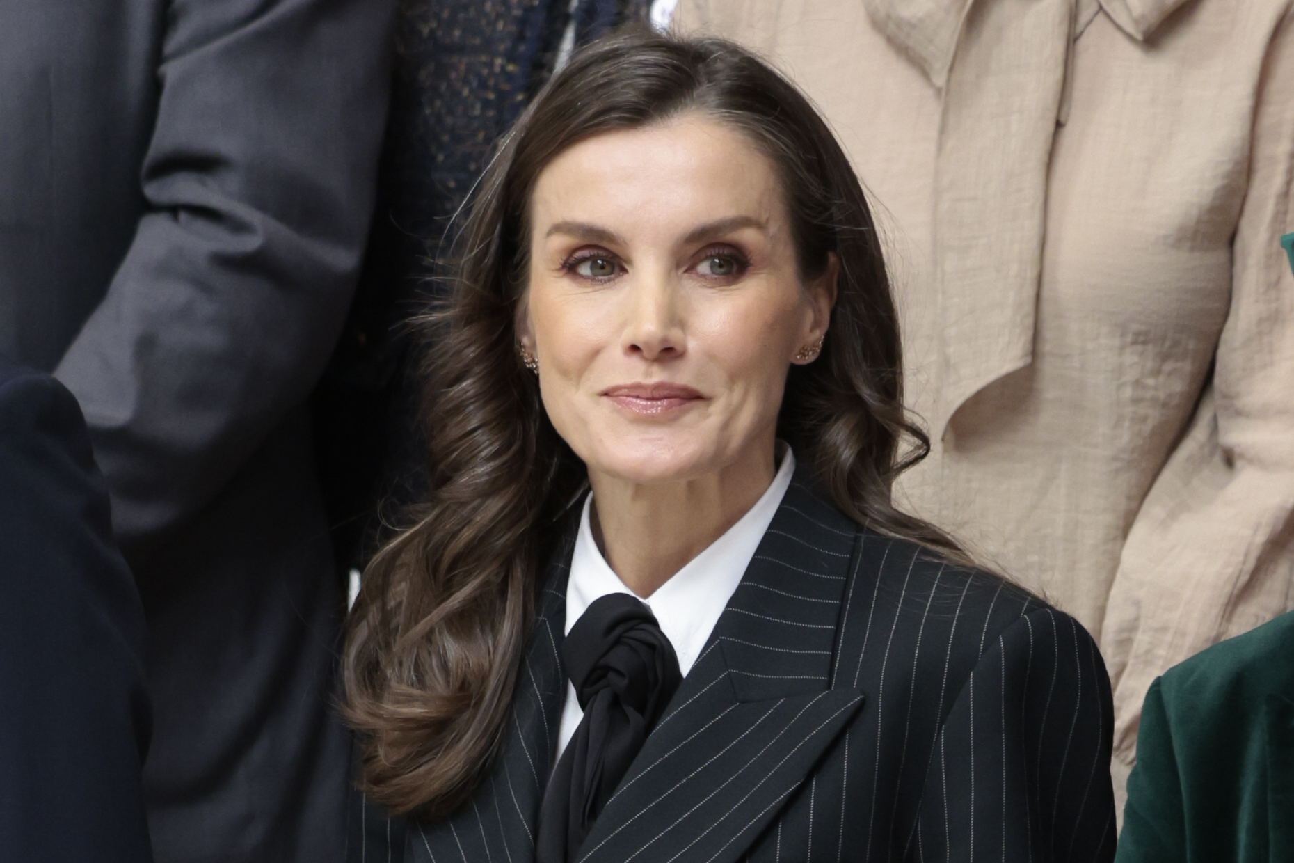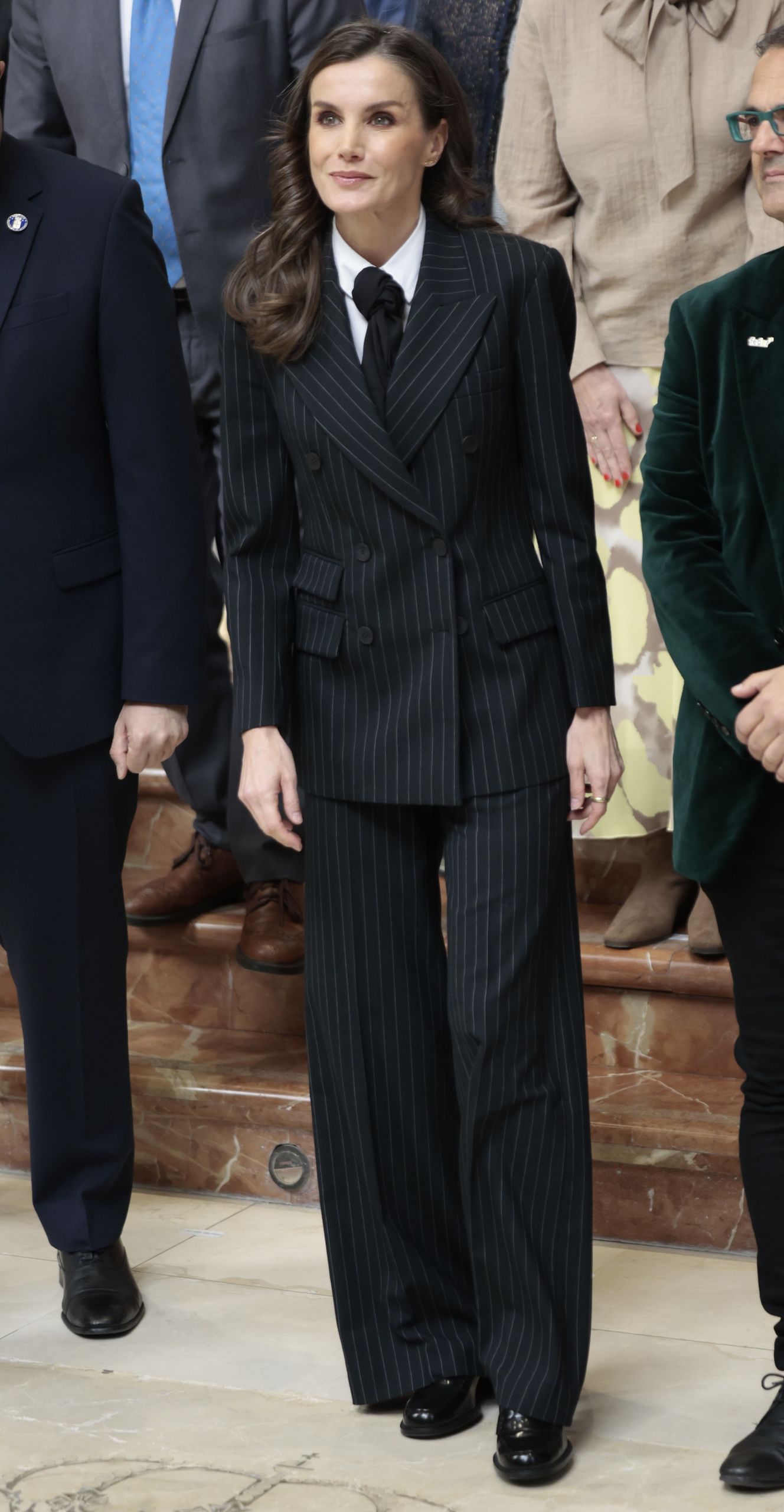 Su estilo para jornada de hoy se ha comparado mucho con el de Melania Trump, primera dama de Estados Unidos, que ayer mismo acudió a un acto en el Capitolio con un look masculino. El traje de la Reina es de la firma francesa Sandro y está por chaqueta de cuello sastre y pantalón recto de pinza con pierna ancha. Lo más llamativo del estilismo es el lazo que simula una corbata y que está inspirado en este accesorio masculino.