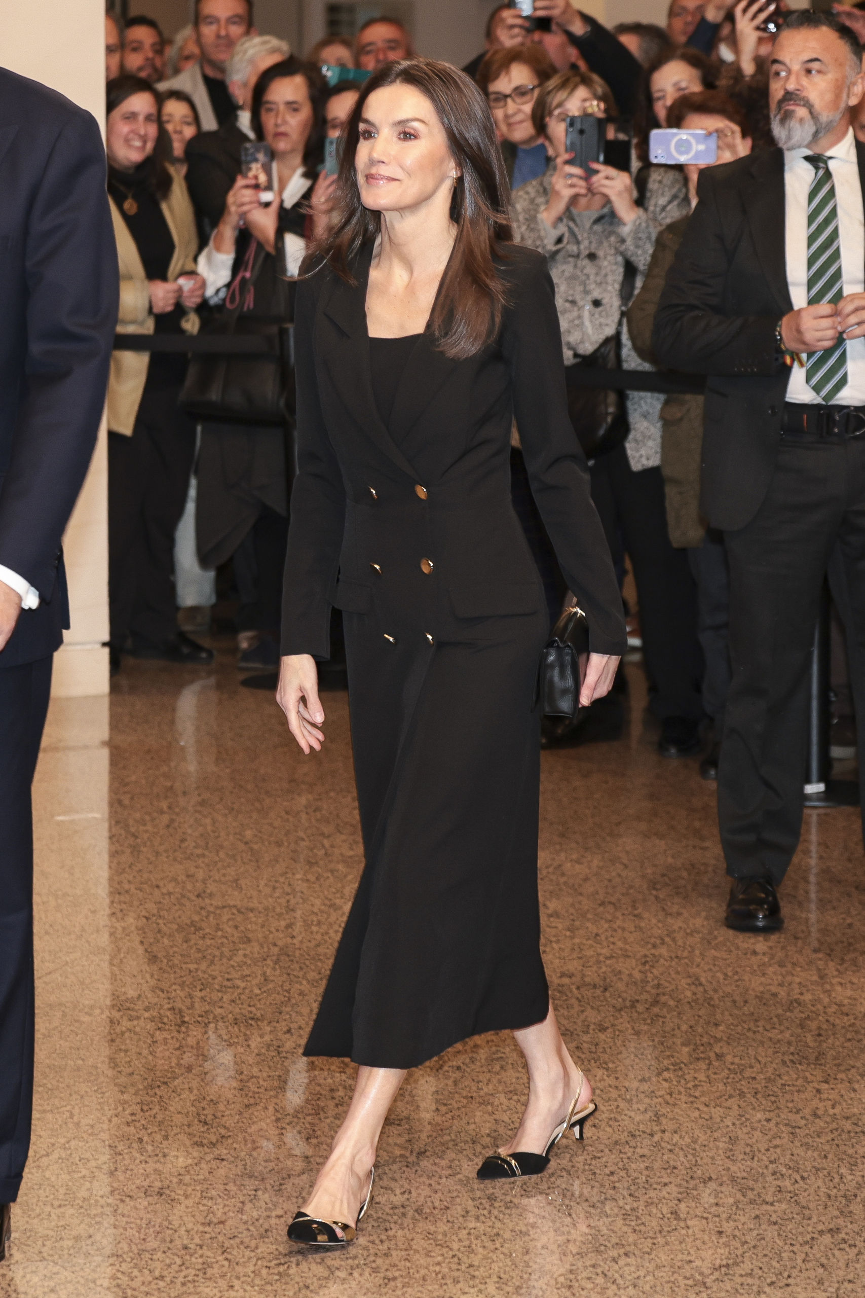 Para este acto y consciente del interés que suscita su armario, la Reina volvió a apostar por la sobriedad y la elegancia con un abrigo de corte recto y largo midi que llevó a modo de vestido y que destacaba por su doble botonadura.