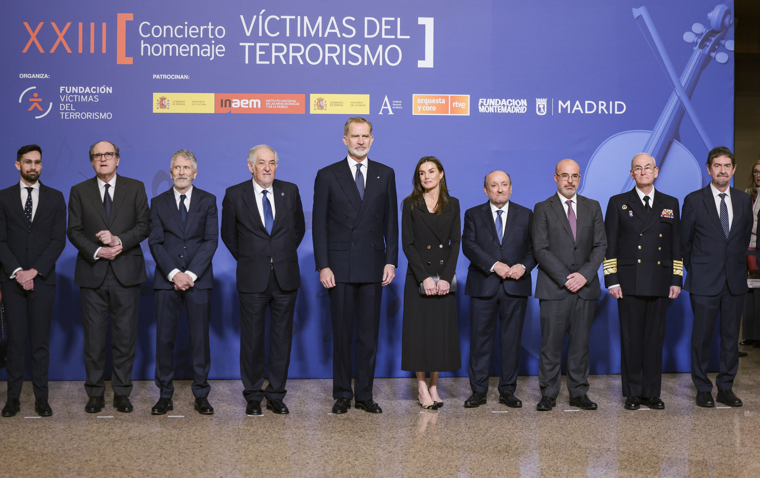 Los Reyes presidieron este jueves en el Auditorio Nacional de Música de Madrid el XXIII Concierto ‘In memoriam’ en homenaje a las Víctimas del Terrorismo, que se celebra anualmente en vísperas del 11 de marzo, día en el que se rememora a las 193 víctimas de los atentados perpetrados en Madrid en esa fecha de 2004.