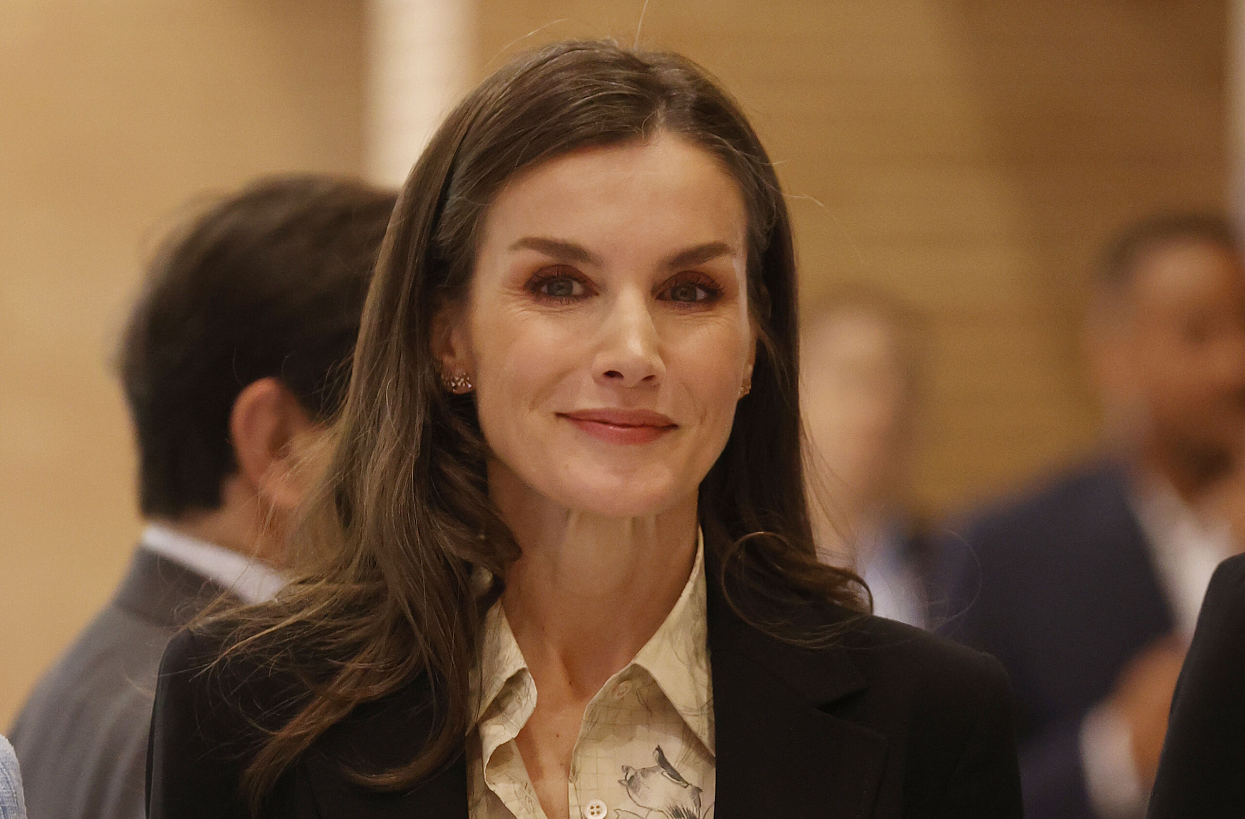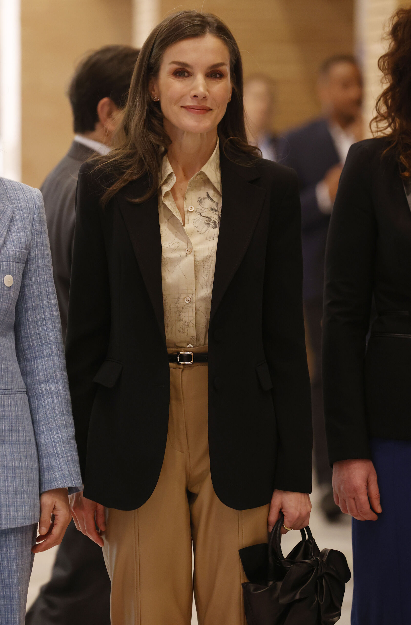 Después de que en las últimas semanas la Reina vistiese exclusivamente con trajes, nos ha sorprendido con un nuevo estilo donde destacaban unos pantalones de cuero en color camel de tiro alto, pinzas y bajo estrecho, camisa en tonos nude de estampado floral muy discreto, americana negra y cinturón negro y fino de Hugo Boss.