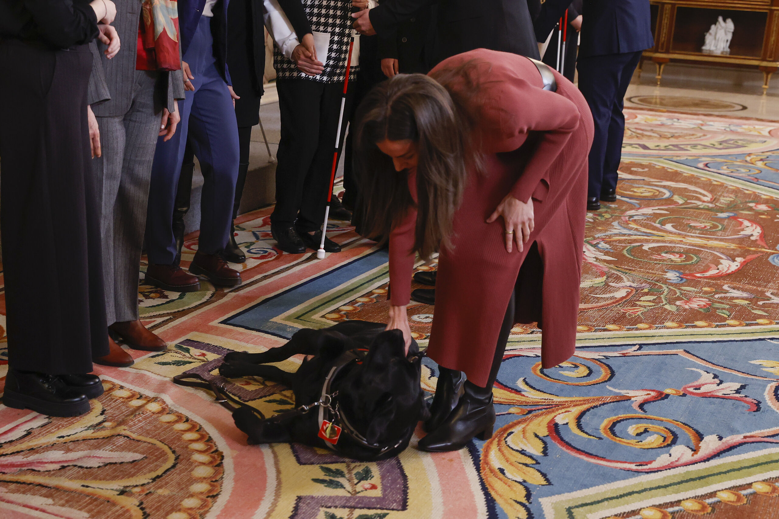 La reina Letizia ha presidido este martes una serie de audiencias en el Palacio de la Zarzuela. En primer lugar a la representación de la Fundación Mujeres y del Fondo de Becas "Fiscal Soledad Cazorla Prieto"; después, a la Federación de Asociaciones de Personas Sordociegas de España, donde uno de sus miembros ha acudido con su perro guía y que ha recibido muy bien los mimos que le ha hecho Doña Letizia. Por último, a la Asociación de Víctimas del Terrorismo, que ha hecho entrega a la Reina del XIII Premio 'Verdad, Memoria, Dignidad y Justicia'.