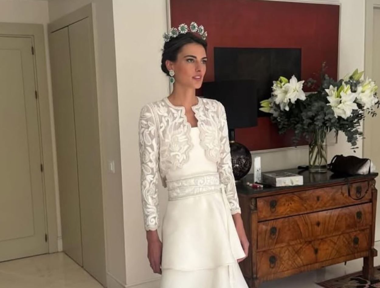 La novia llevó un vestido del diseñador Jorge Vázquez, el mismo diseñador que vistió a su hermana Sol en 2023, con un diseño de falda de volantes con fajín bordado y bolero del mismo bordado artesano. Además del vestido, destacaba una tiara de flores diamantes y esmeraldas que pertenecieron a la reina Isabel II.