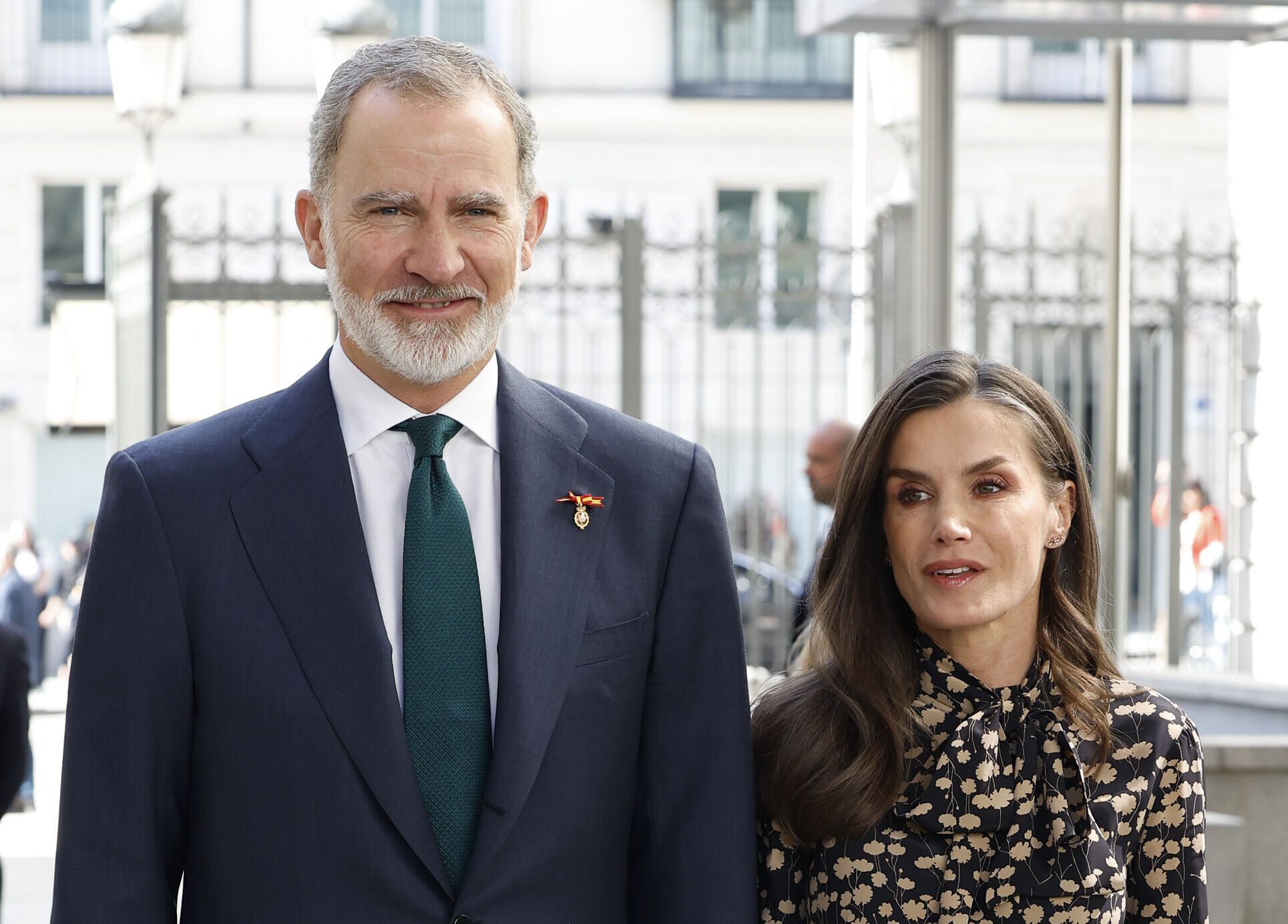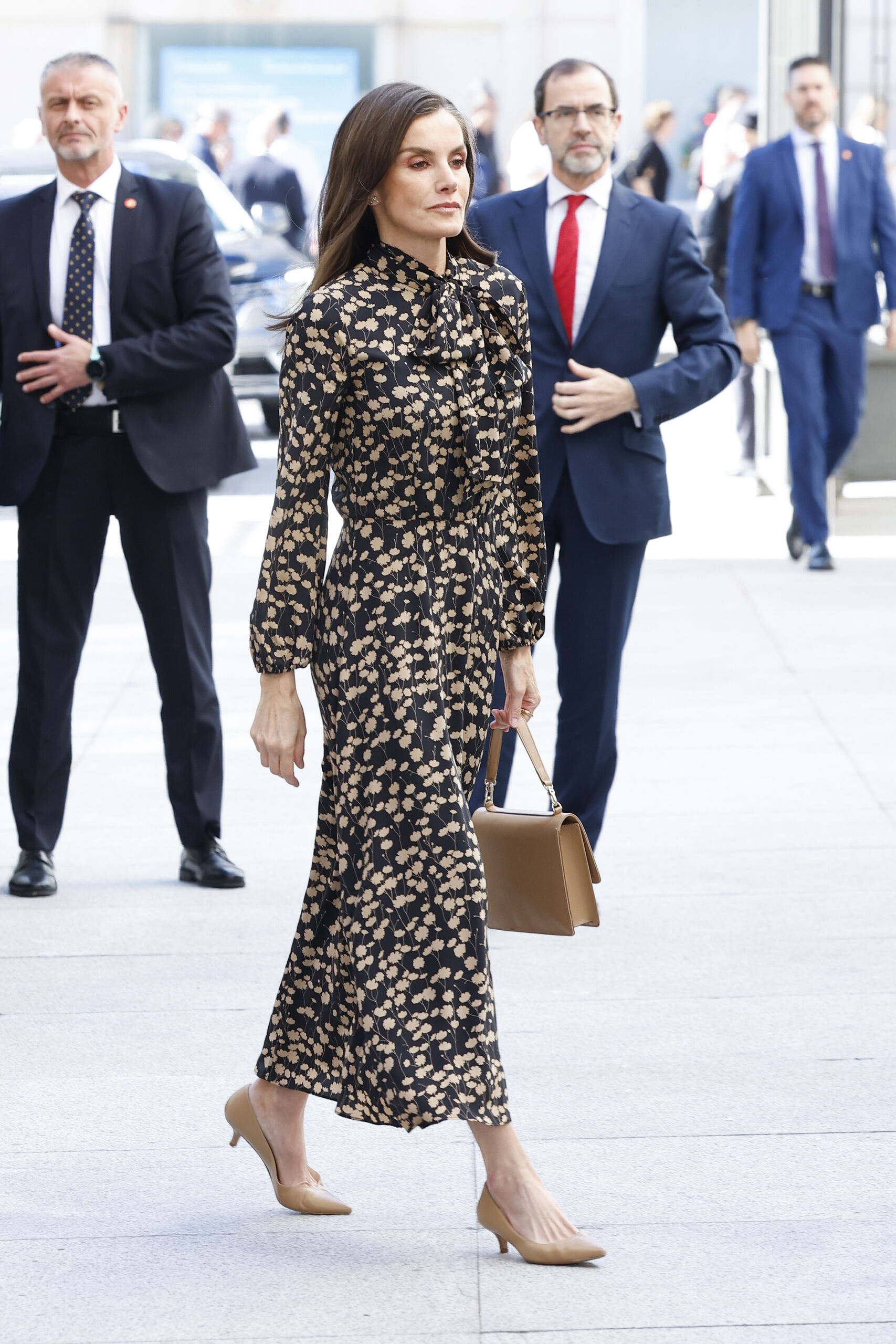 Para esta visita al Congreso, la reina ha lucido un vestido de estampado floral atemporal, manga larga escote con lazo y corte midi de Massimo Dutti en 2022para asistir al Centro de Protonterapia del Hospital Universitario Quirón Salud. Como complementos ha lucido unos zapatos de tacón sensato de Magrit, bolso de la misma marca y pendientes de Gold & Roses en oro rosado y diamantes.