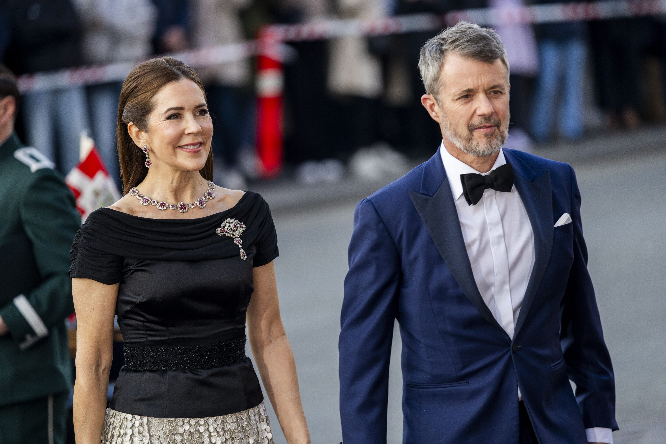 La reina Mary optó por un diseño vintage de 2007 de Malene Birger, con falda de corte sirena, con lentejuelas blancas y un top negro tipo corsé, de manga corta y escote. Como complementos lució parte del set de rubíes que la reina Ingrid le entregó a su nieto Federico X.